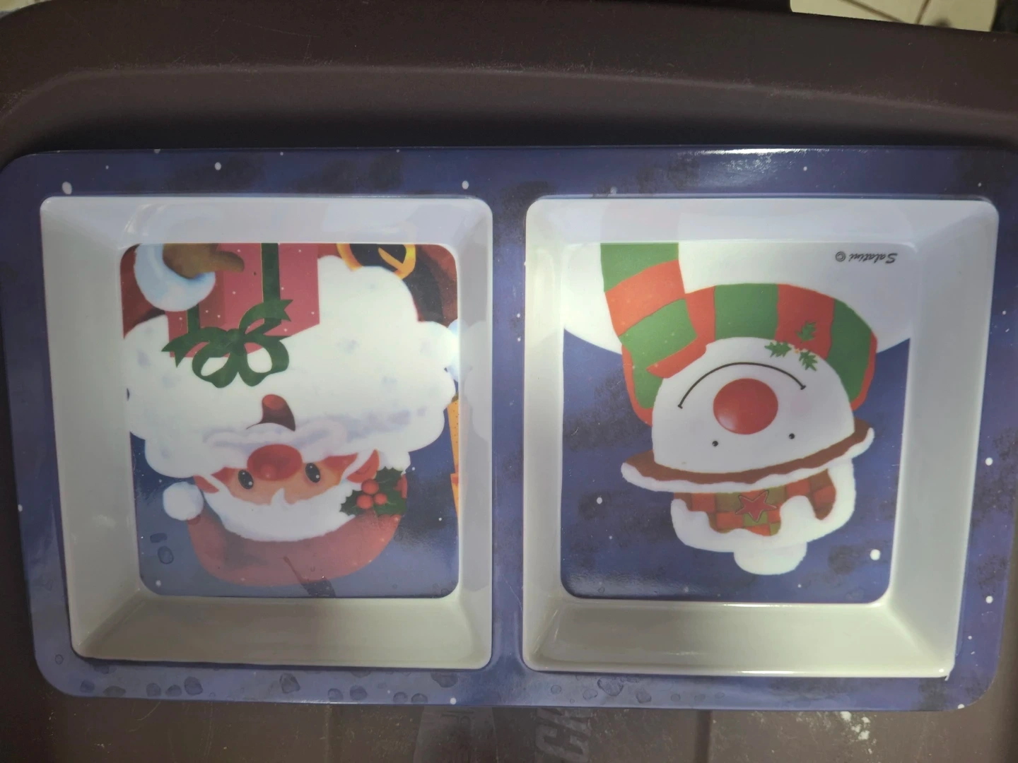 Here's a cute Salatini divided serving dish with a Christmas theme! It features Santa and a snowman design, perfect for serving snacks or appetizers during the holidays