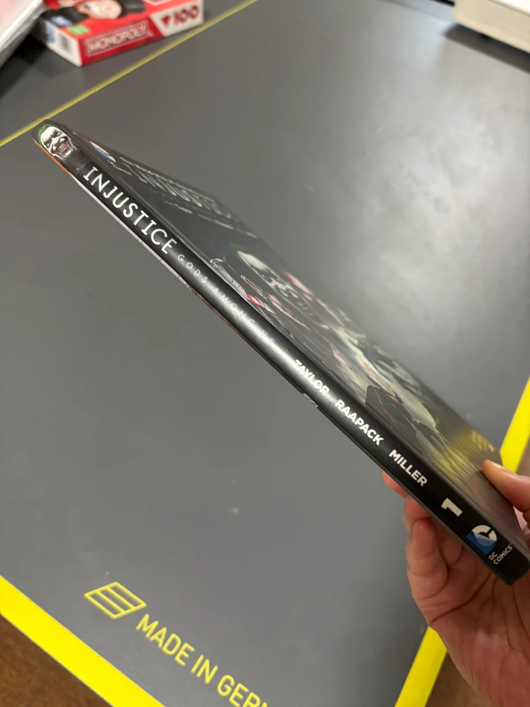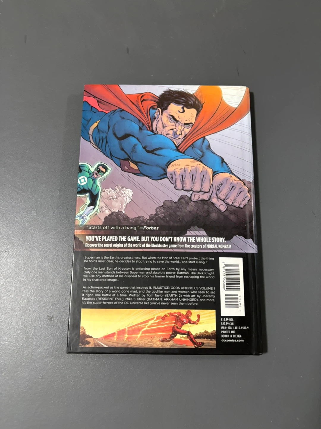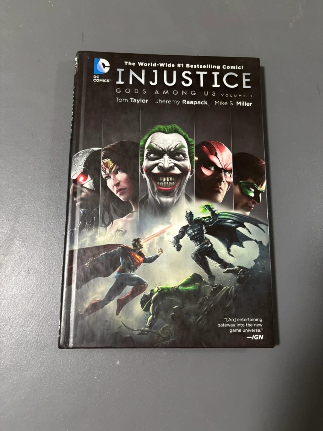 Selling Injustice Gods Among Us Volume 1, written by Tom Taylor, Jheremy Raapack, and Mike S. Miller. It's a DC Comics graphic novel that's a world-wide #1 Bestselling Comic! Enjoy the secret origins of the world of the blockbuster game from the creators of MORTAL KOMBAT!