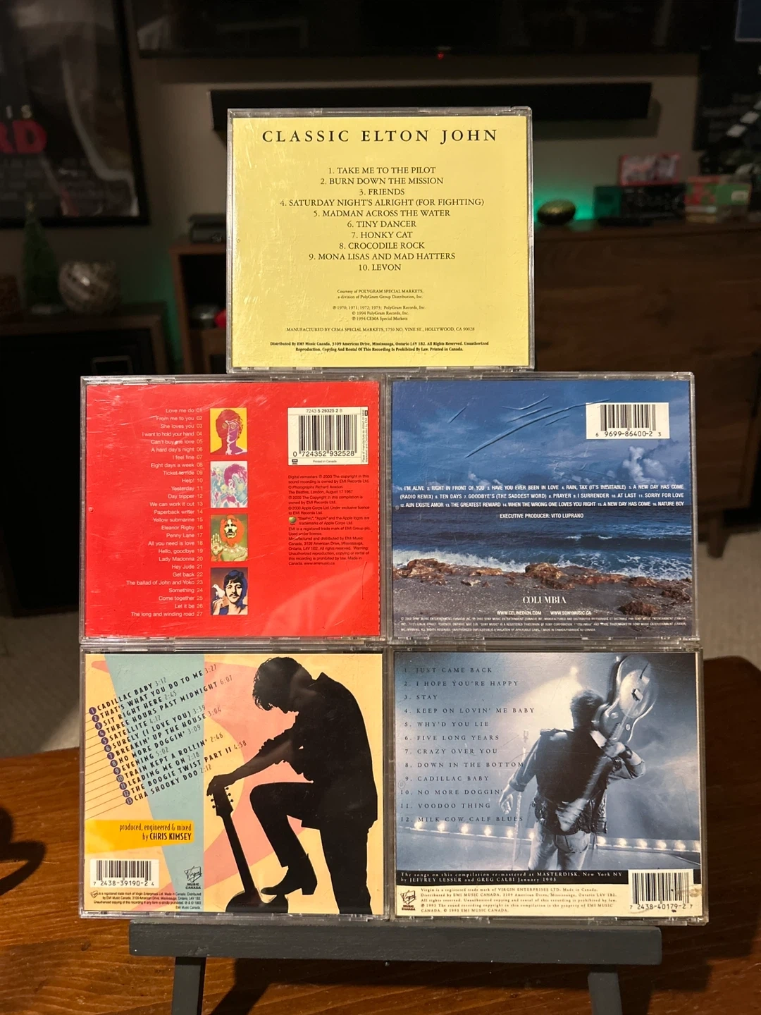 Selling a mix of CDs featuring artists like Celine Dion, The Beatles, Elton John, and Colin James! Great for anyone looking to expand their music collection with some classics.