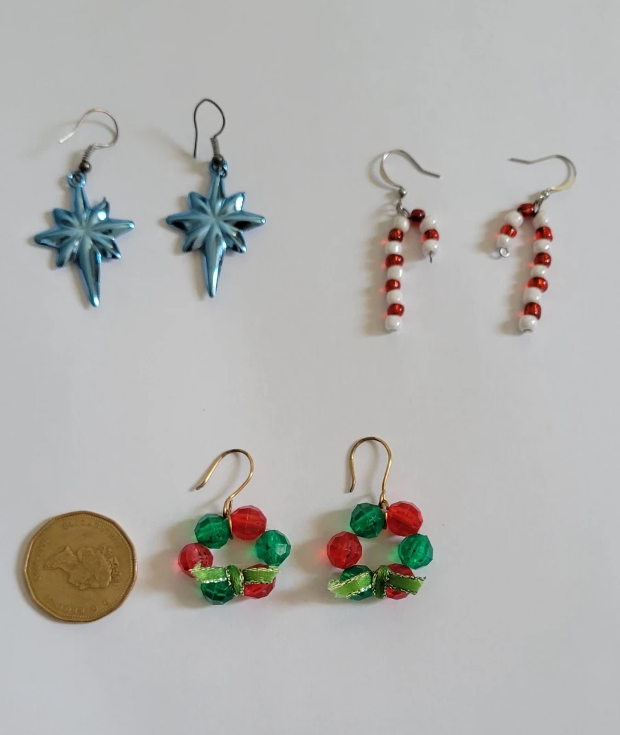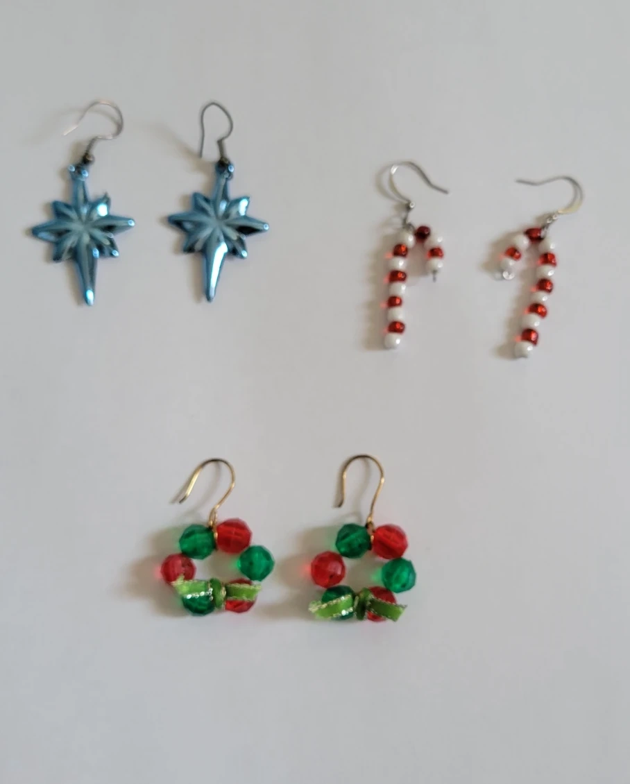 Here's a cute set of three pairs of Christmas-themed earrings! They're perfect for adding a festive touch to your holiday outfits. The set includes star, candy cane, and wreath designs.