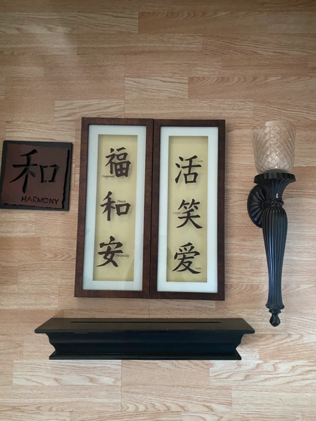 Selling a set of framed art pieces. One features the word 'Harmony' and the other two have the words 'Happiness, Peace, Tranquility' and 'Laugh, Live, Love' written on them. They would make a great addition to any room!