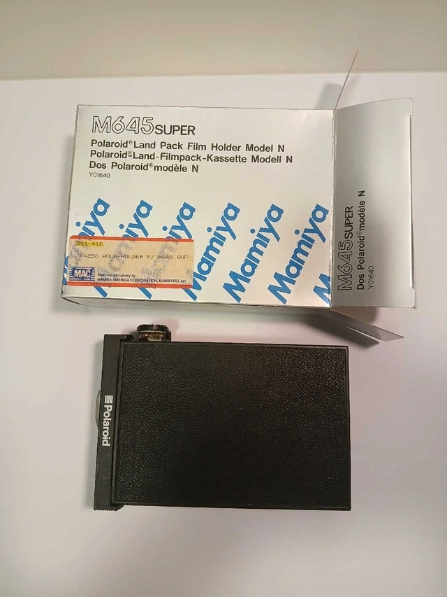 Mamiya M645 Super Polaroid Film Holder Model N. As new with dark slide, original box and some film inside. Located between Brantford and Cambridge. Willing to meet in Burlington for very serious buyers from GTA. I also have lots of tripods, backgrounds, light stands, other Mamiya 645 & 67 cameras, studio flash units, etc. Message me with specific questions and I'll provide my phone number.