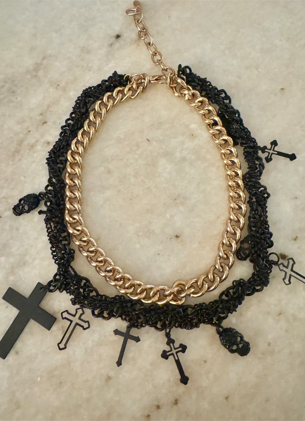 • Layered necklace set (gold chain + black chain with crosses)