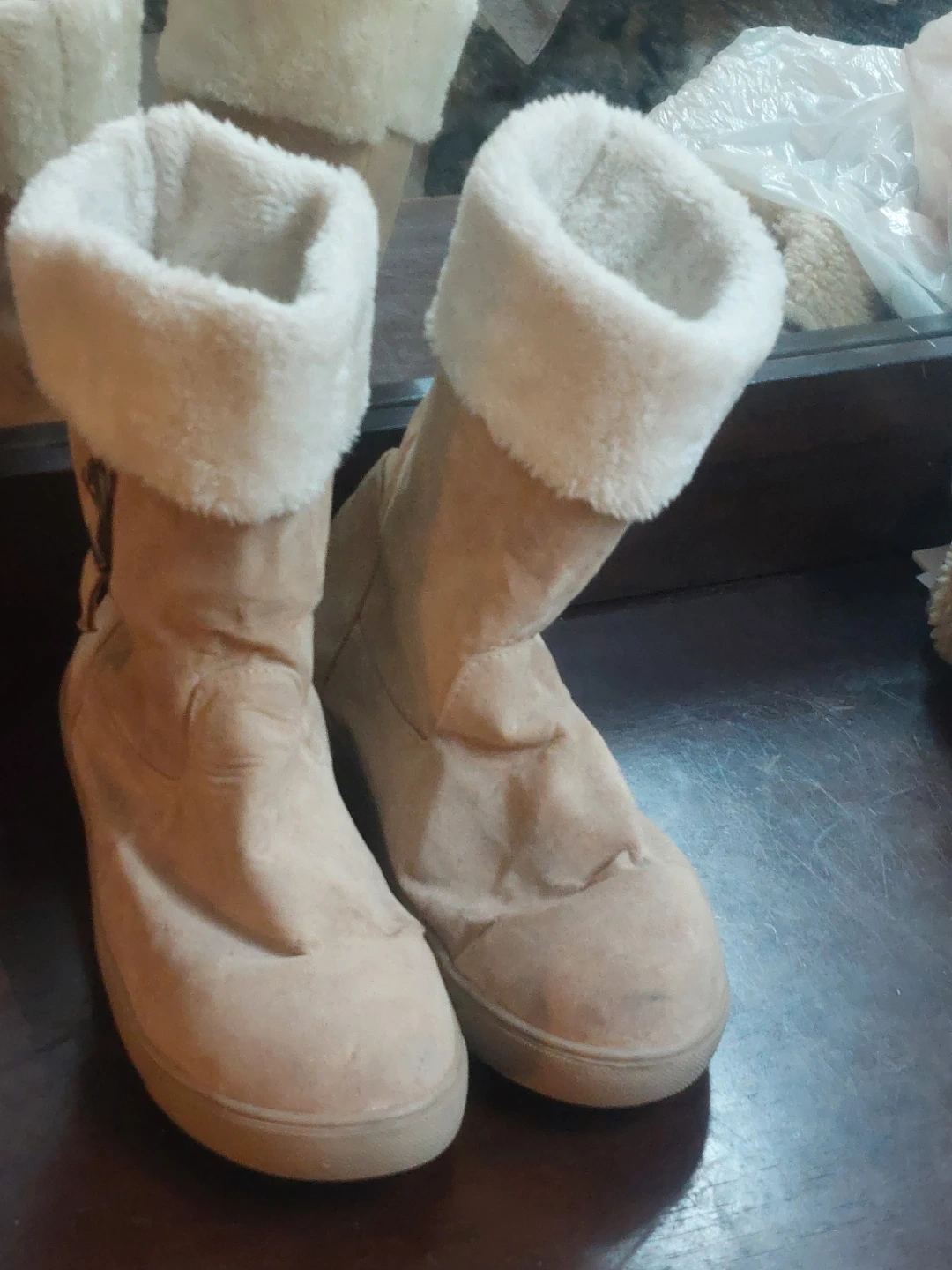 These cozy beige boots are perfect for winter! They feature a soft fur trim and a comfortable, casual style. They show some signs of wear, as you can see in the photos.