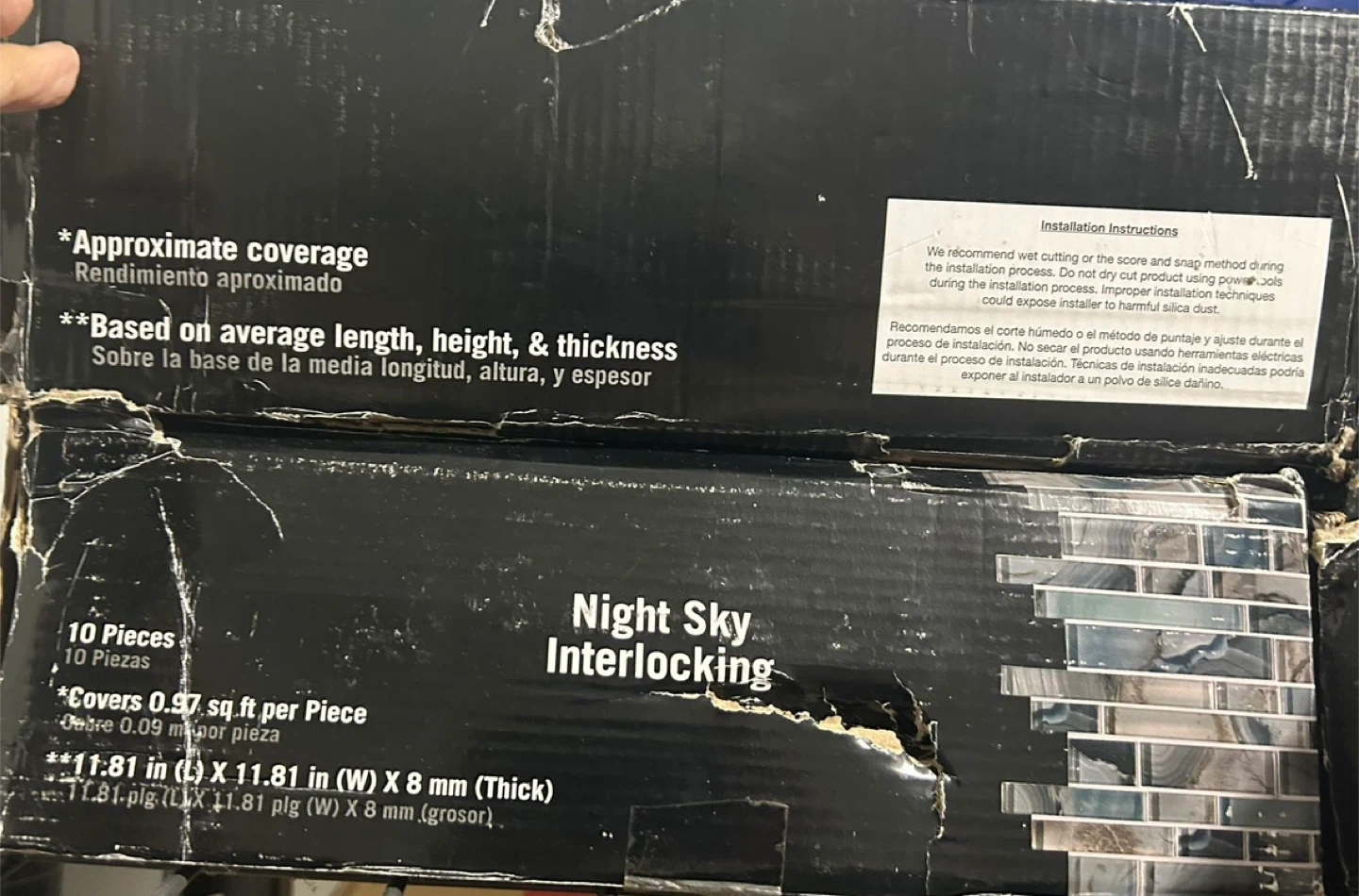 I have 4 boxes of Night Sky Interlocking mosaic tiles for sale. They are brand new and still in the original packaging! Each piece covers 0.97 sq ft, and the dimensions are approximately 11.81 in x 11.81 in x 8 mm. Perfect for adding a touch of elegance to kitchens, backsplashes, and more!