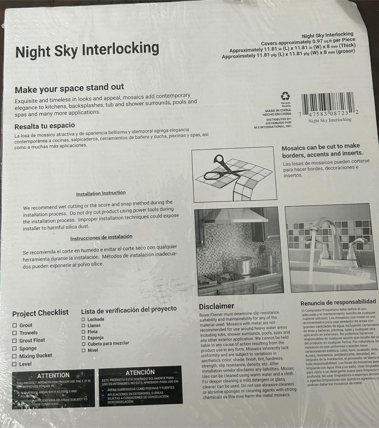 I have 4 boxes of Night Sky Interlocking mosaic tiles for sale. They are brand new and still in the original packaging! Each piece covers 0.97 sq ft, and the dimensions are approximately 11.81 in x 11.81 in x 8 mm. Perfect for adding a touch of elegance to kitchens, backsplashes, and more!