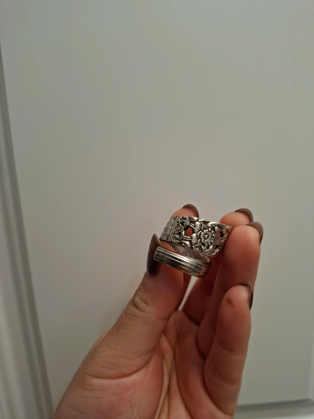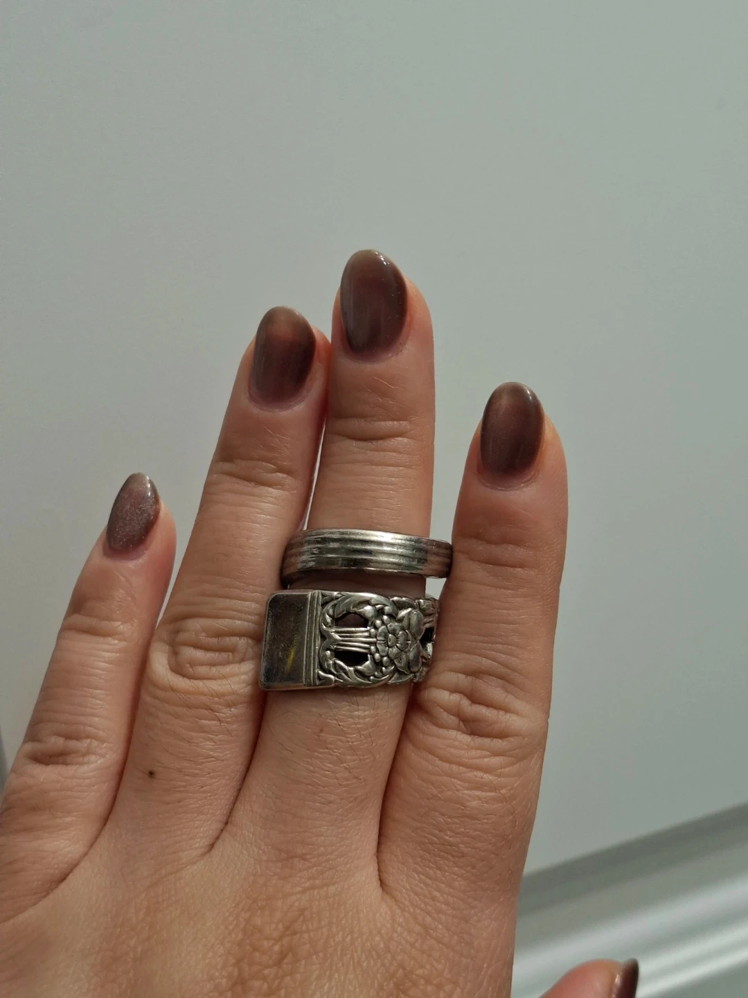 Selling two handmade rings crafted from silver spoons! One is a plain band, and the other features a floral design. They're in good condition and ready to wear.