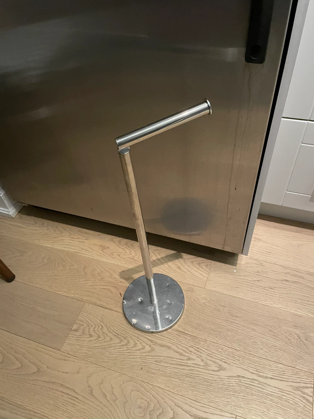 This is a toilet paper holder stand, perfect for any bathroom! It's in good condition and ready to use. No need to mount anything to the wall, just place it where you need it