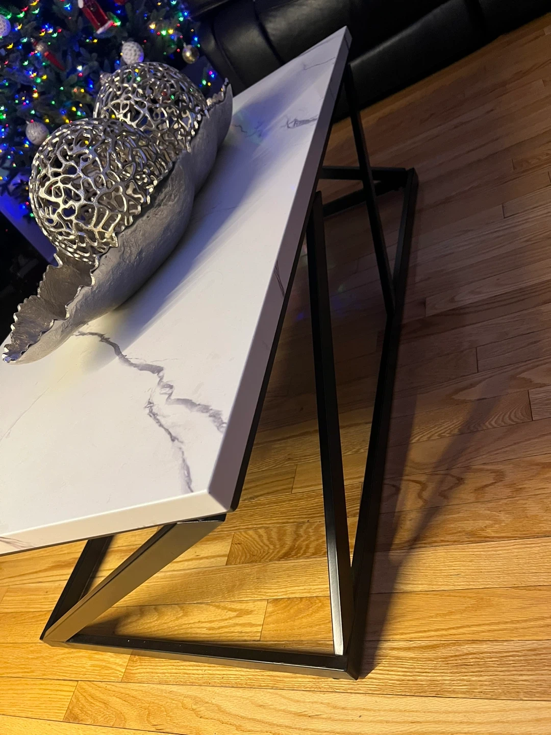Selling a modern coffee table with a beautiful white marble top and a sleek, geometric black metal base. It's in great condition and would be a stylish addition to any living room!