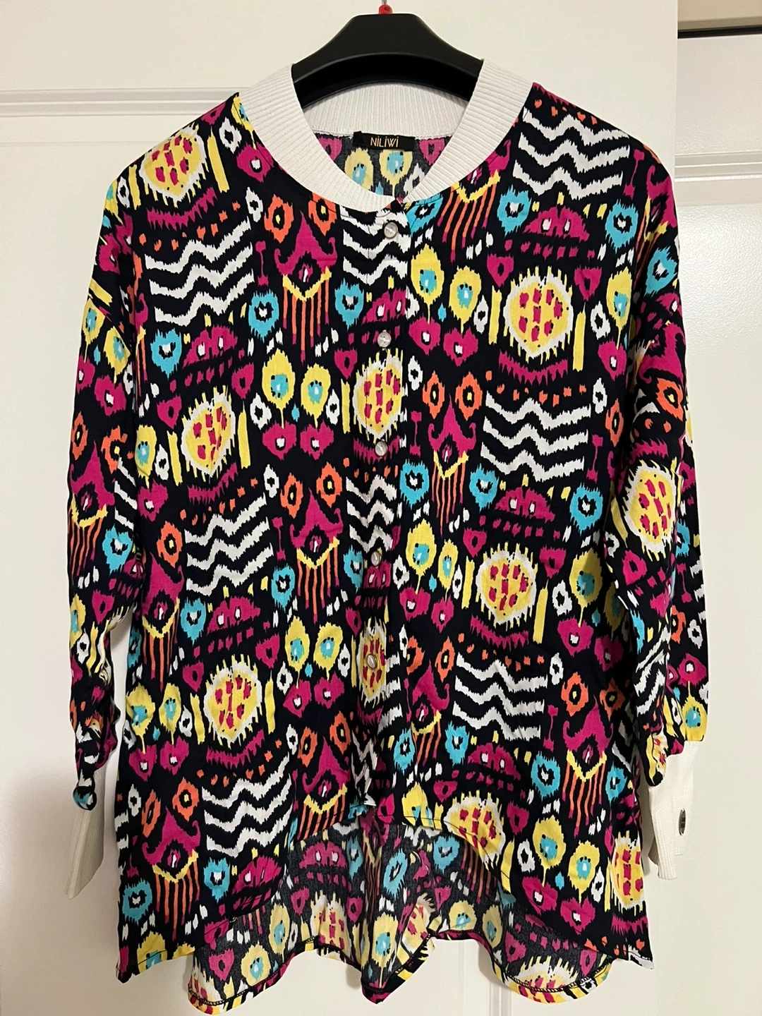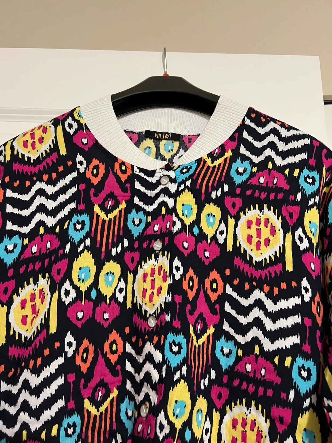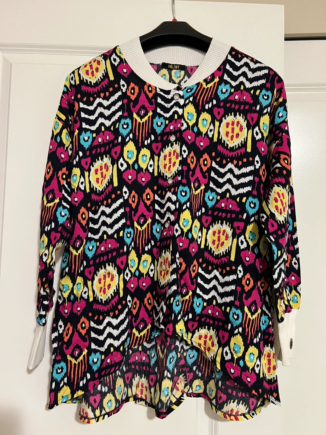 This is a Nili Lotan top with a vibrant and colourful print. It features a white ribbed collar and cuffs, adding a touch of contrast to the bold pattern. It's in great condition and ready for a new home