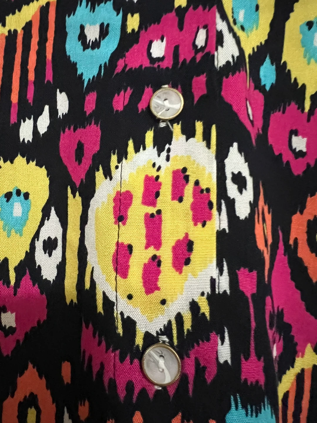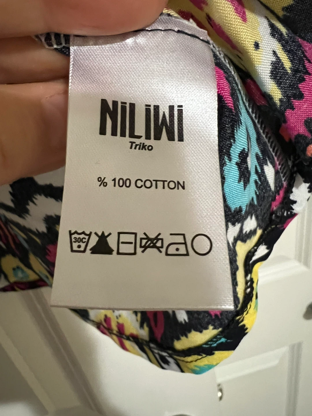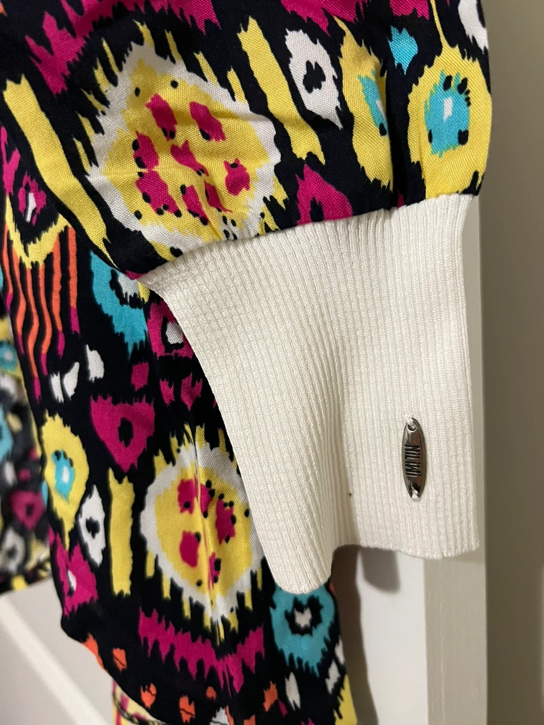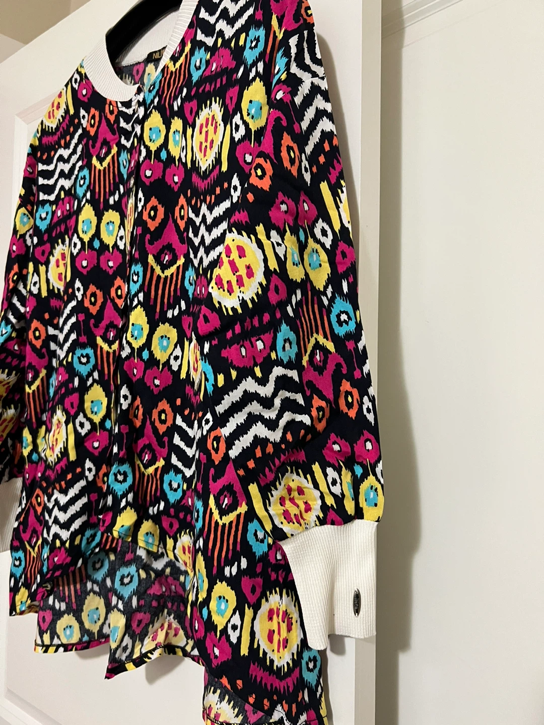 This is a Nili Lotan top with a vibrant and colourful print. It features a white ribbed collar and cuffs, adding a touch of contrast to the bold pattern. It's in great condition and ready for a new home