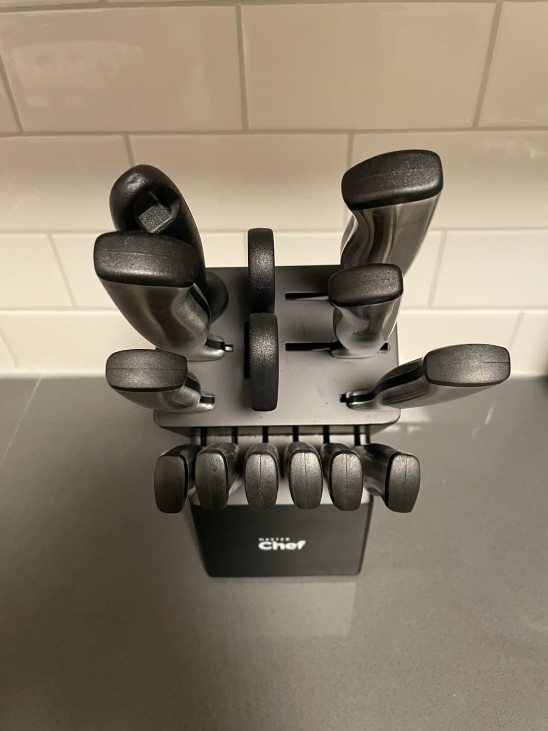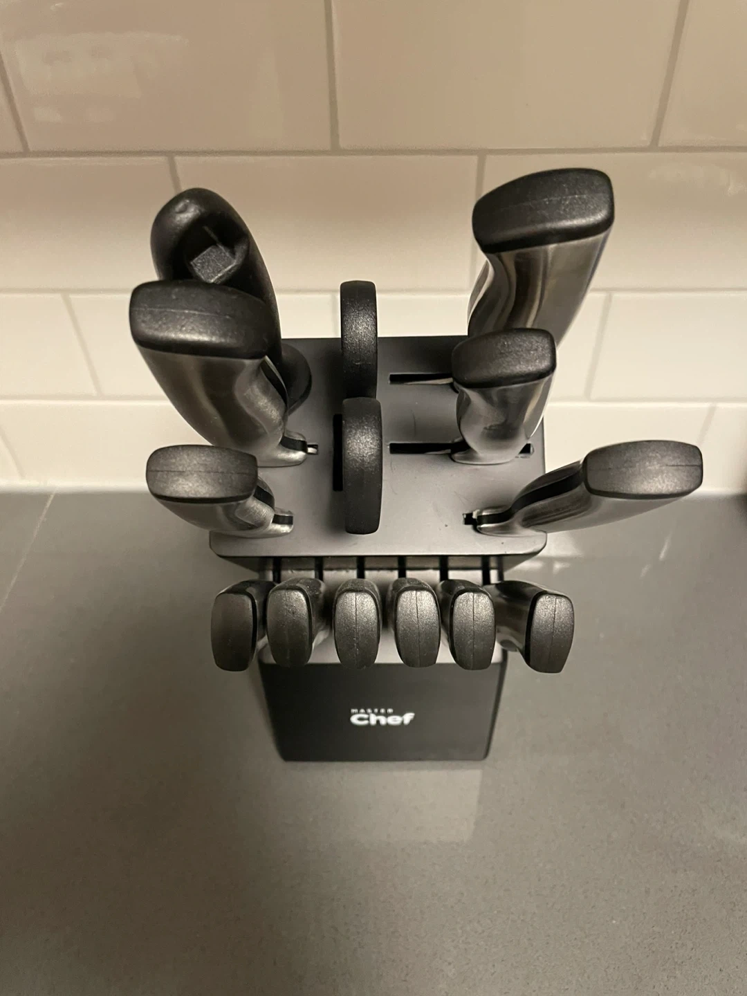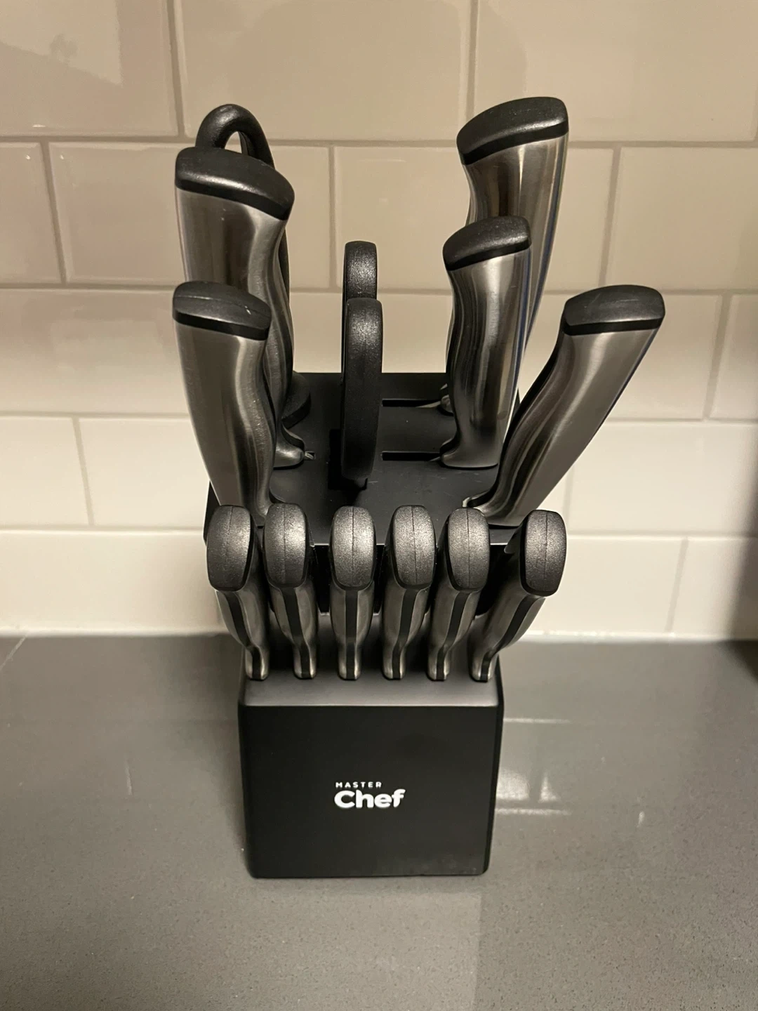 Selling a Master Chef knife block set. It includes various knives and a block to store them. Great for any kitchen!