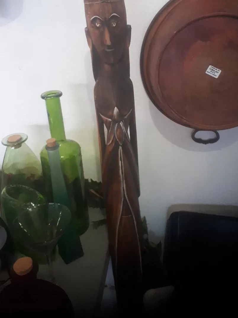 Here's a unique wooden carved figure! It has a lovely, rustic charm that would look great in any home. It's in good condition and ready to be displayed