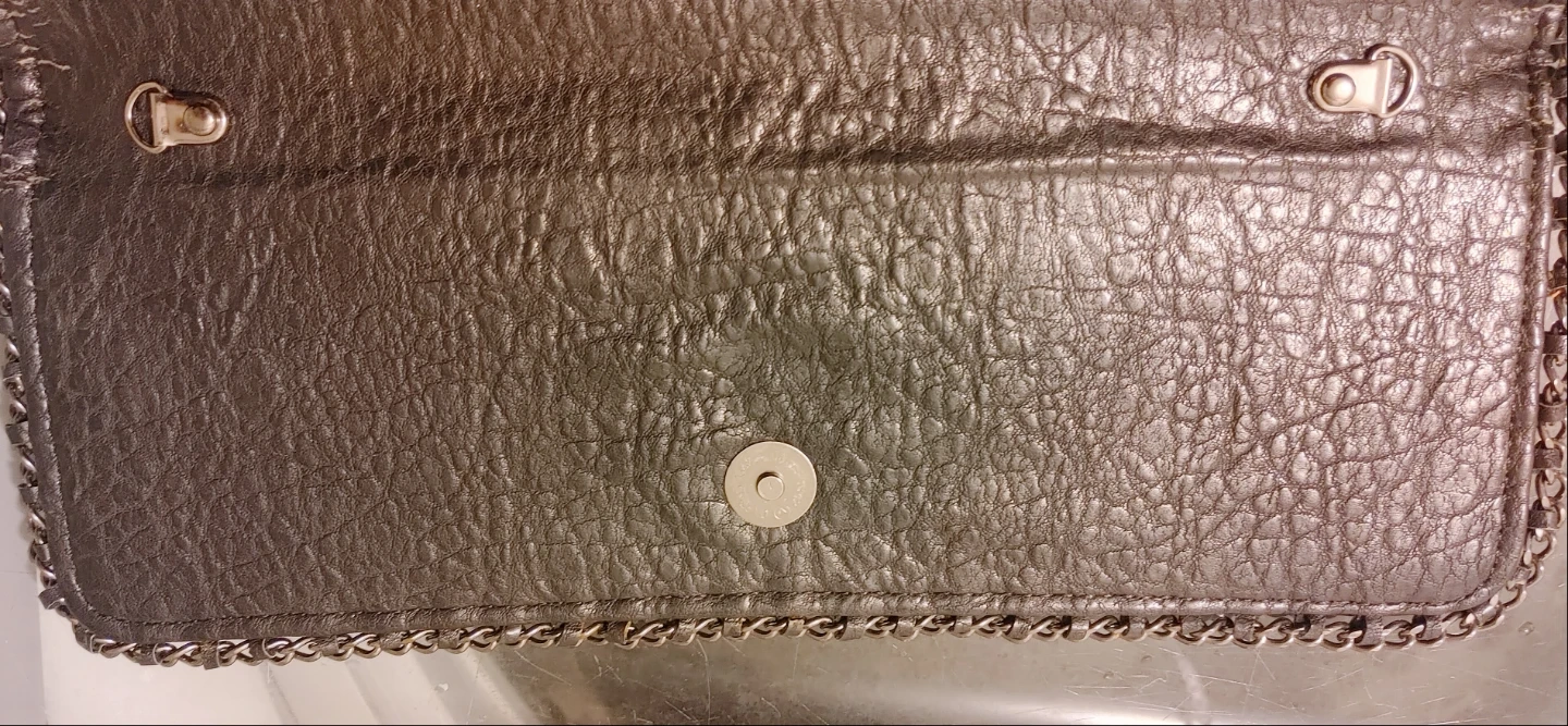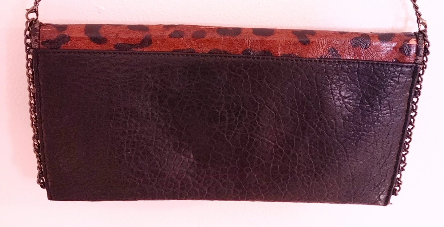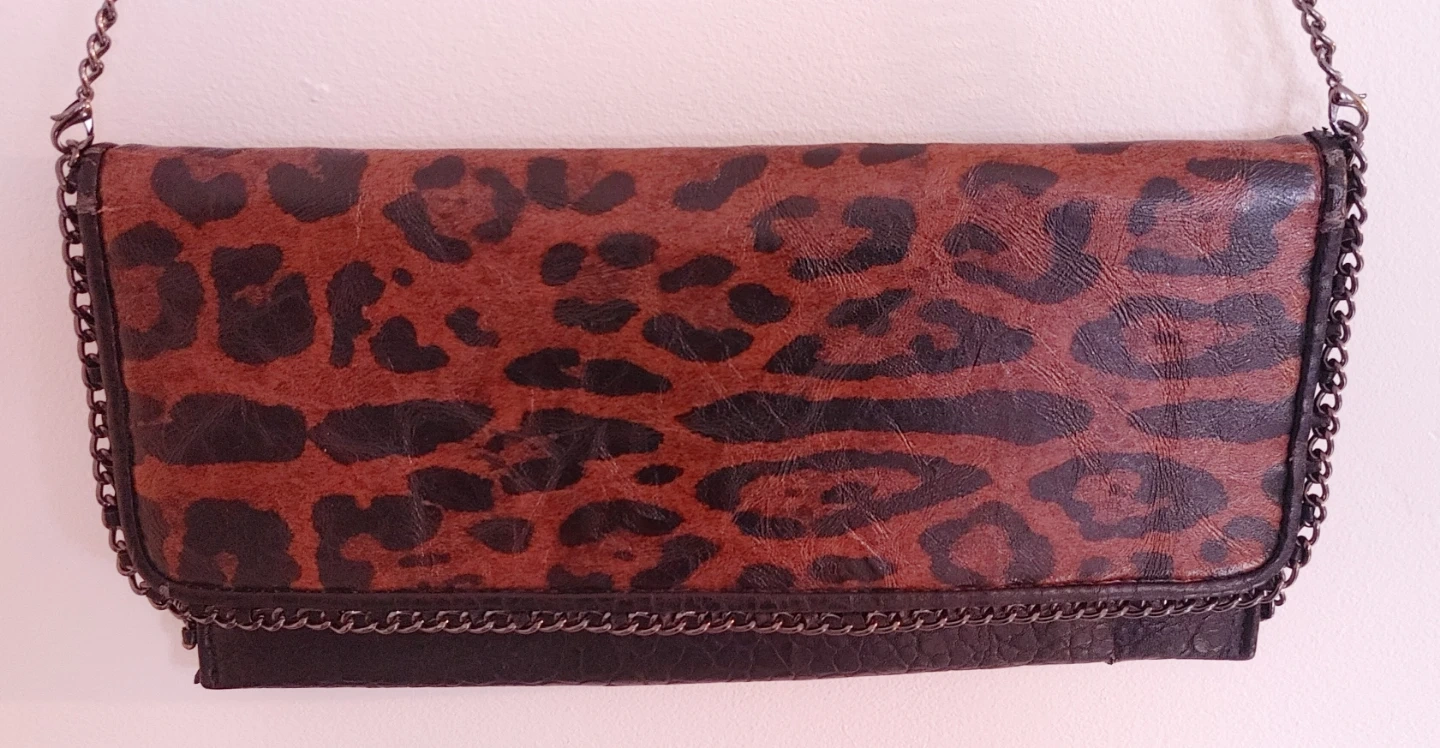 Faux leather leopard print clutch with removable chain strap. Snap button closure with a zipper pocket and interior pockets. Excellent condition like new. No stains or tears. Thoroughly cleaned and disinfected. Smoke free home pick up Mt Brydges cash only.