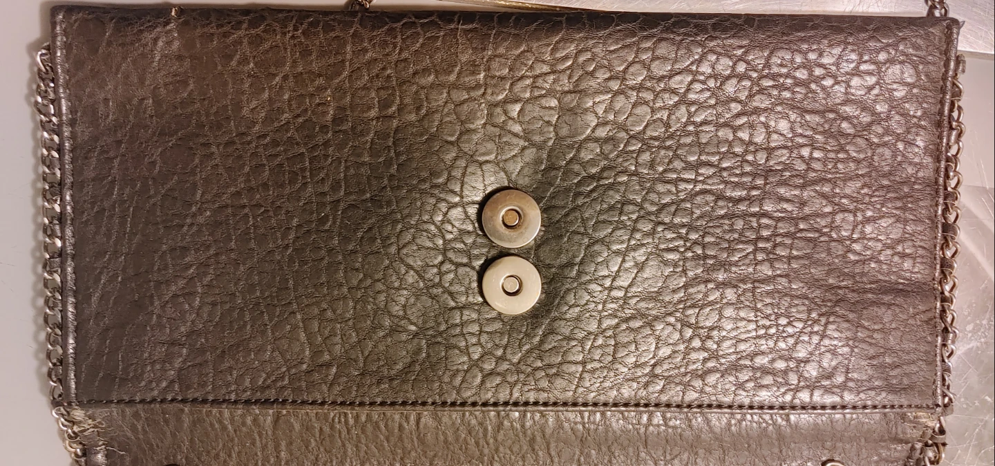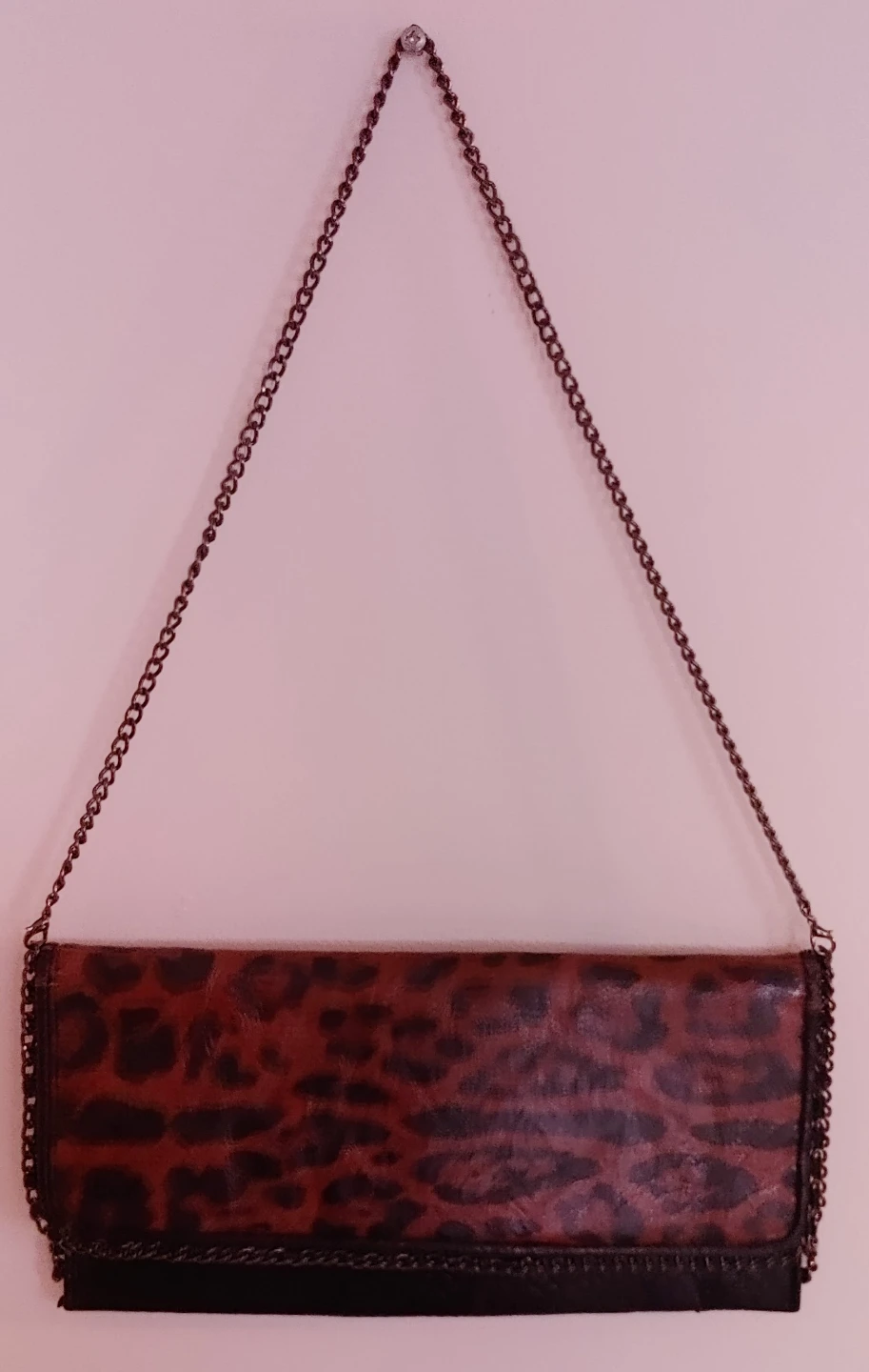Faux leather leopard print clutch with removable chain strap. Snap button closure with a zipper pocket and interior pockets. Excellent condition like new. No stains or tears. Thoroughly cleaned and disinfected. Smoke free home pick up Mt Brydges cash only.