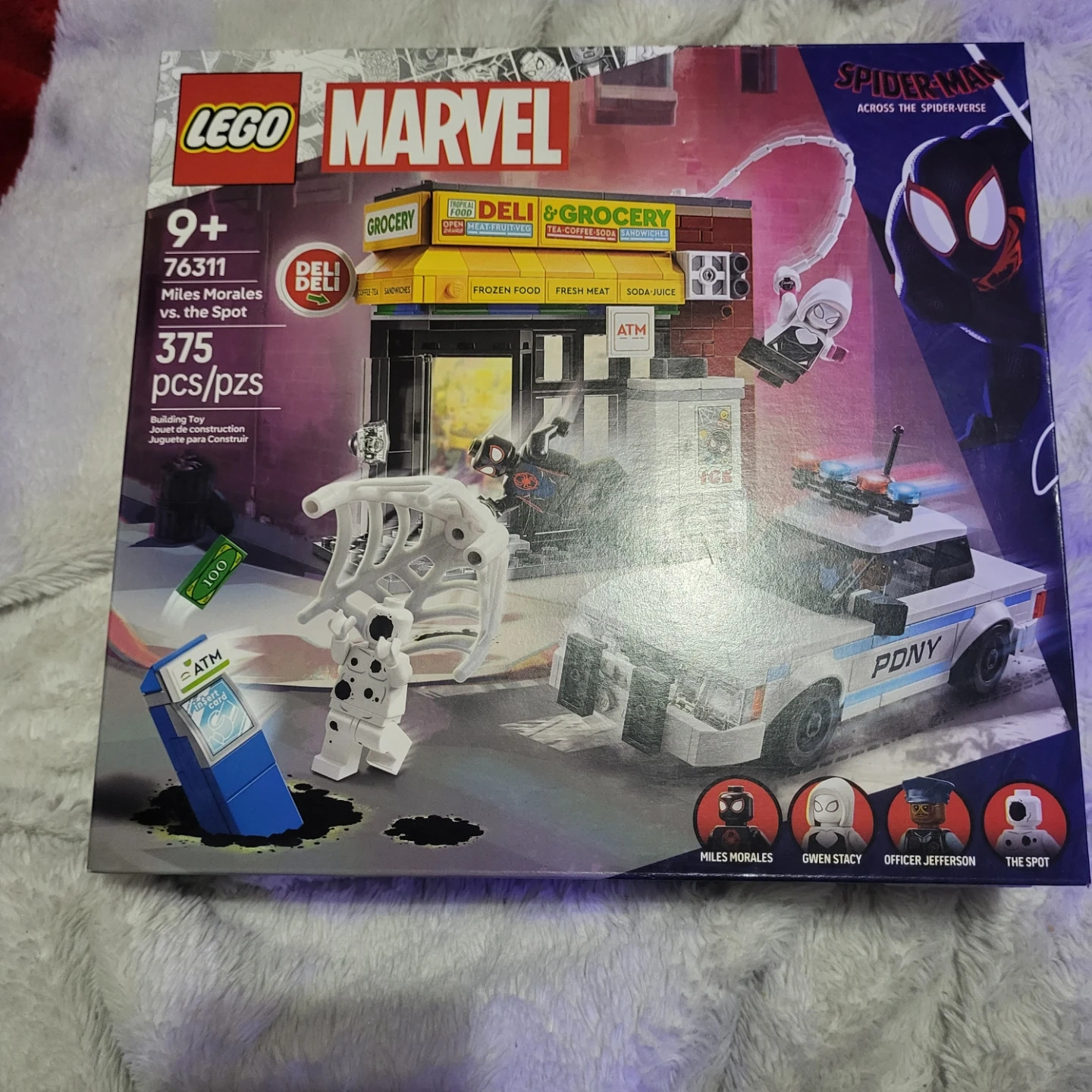 Selling a brand new, unopened LEGO Marvel set 76311, featuring Miles Morales vs. The Spot! This set is perfect for builders aged 9+. It includes 375 pieces to build a fun scene with a deli & grocery store, an ATM, and cool minifigures of Miles Morales, Gwen Stacy, Officer Jefferson, and The Spot. Get ready for some Spider-Verse action!