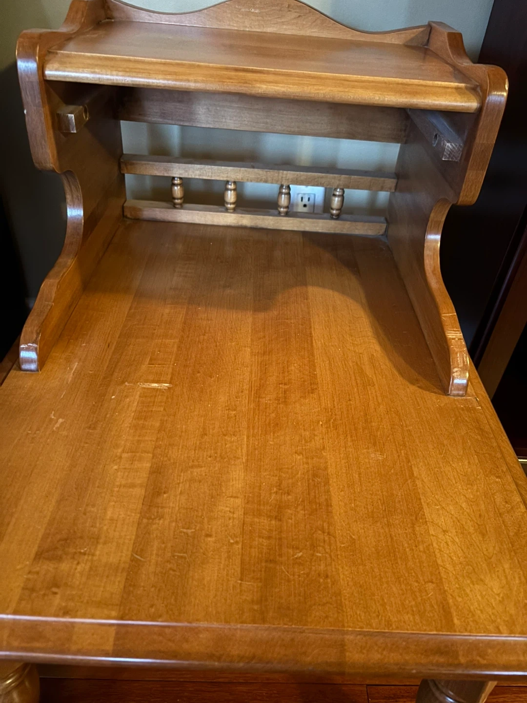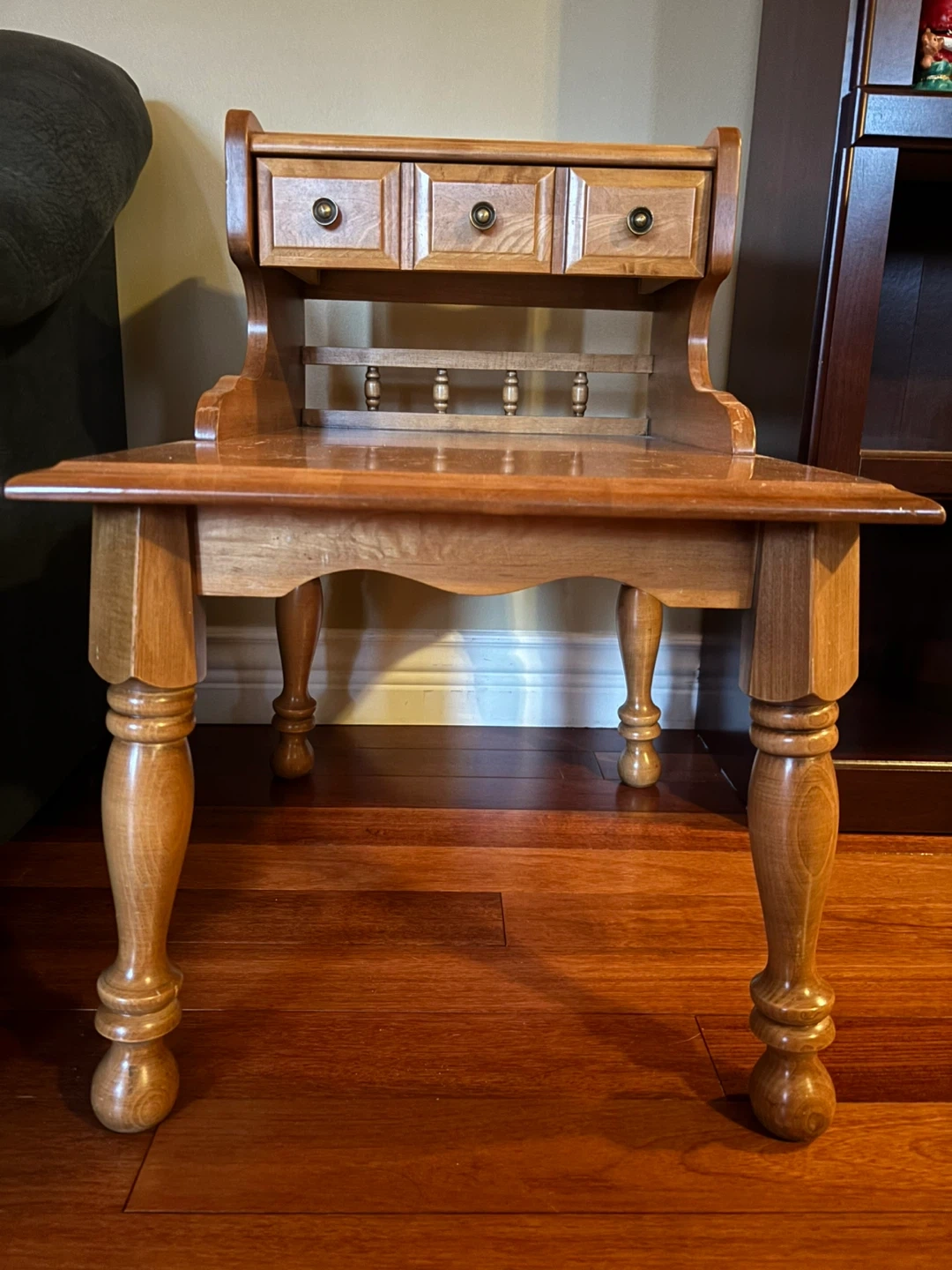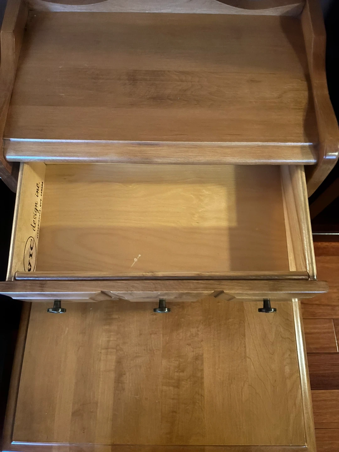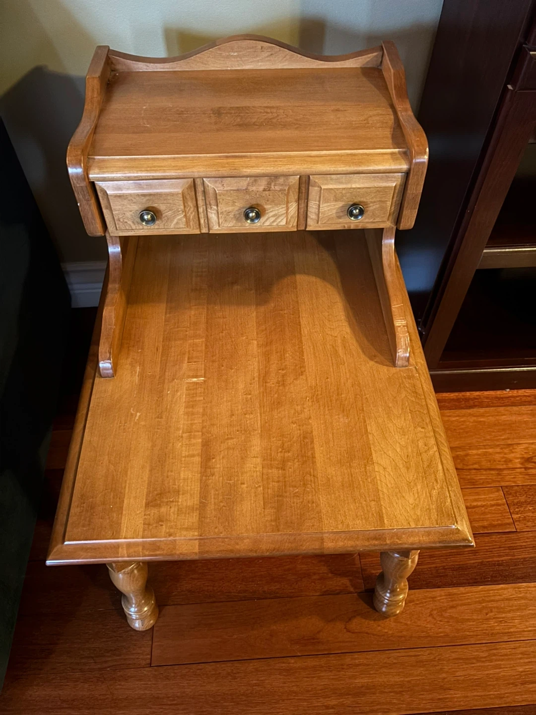 Selling a lovely side table from VIC Design Inc. It's a charming piece with a warm, wooden finish. It features a small shelf and three drawers up top, perfect for storing small items or displaying decor. A great addition to any room!
