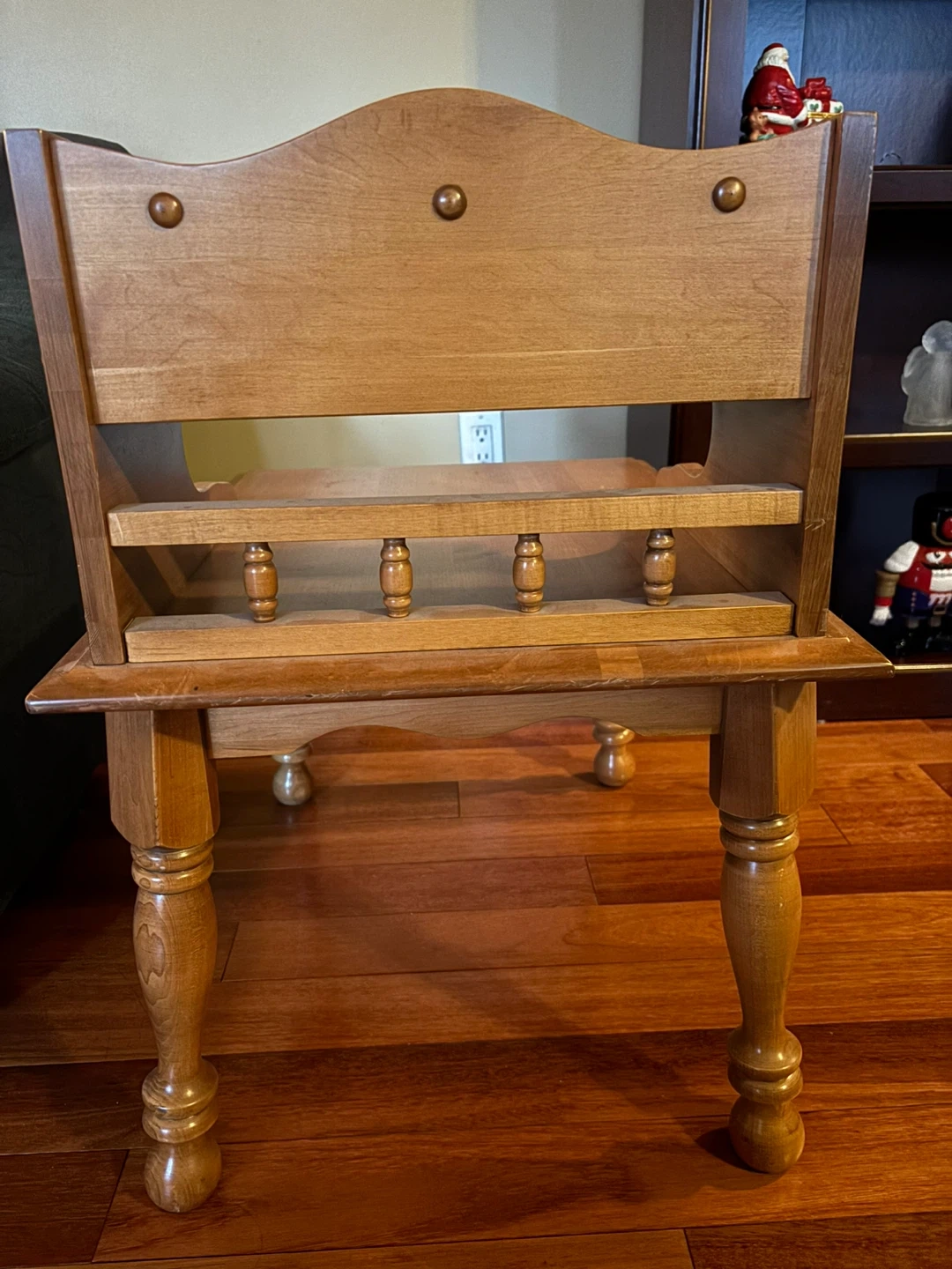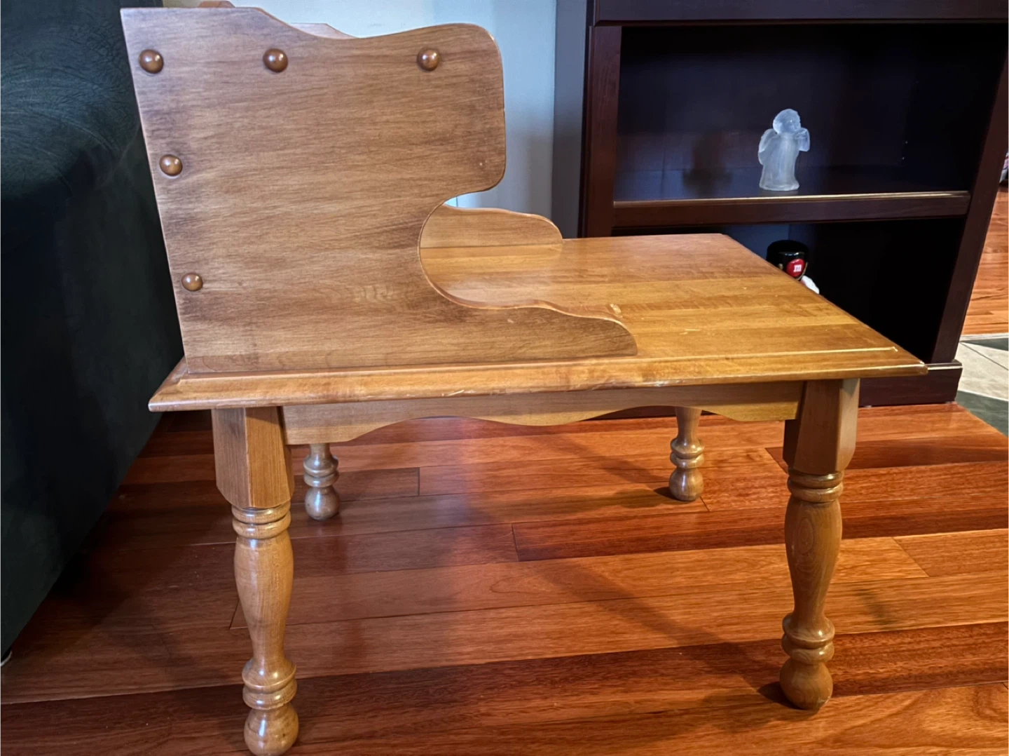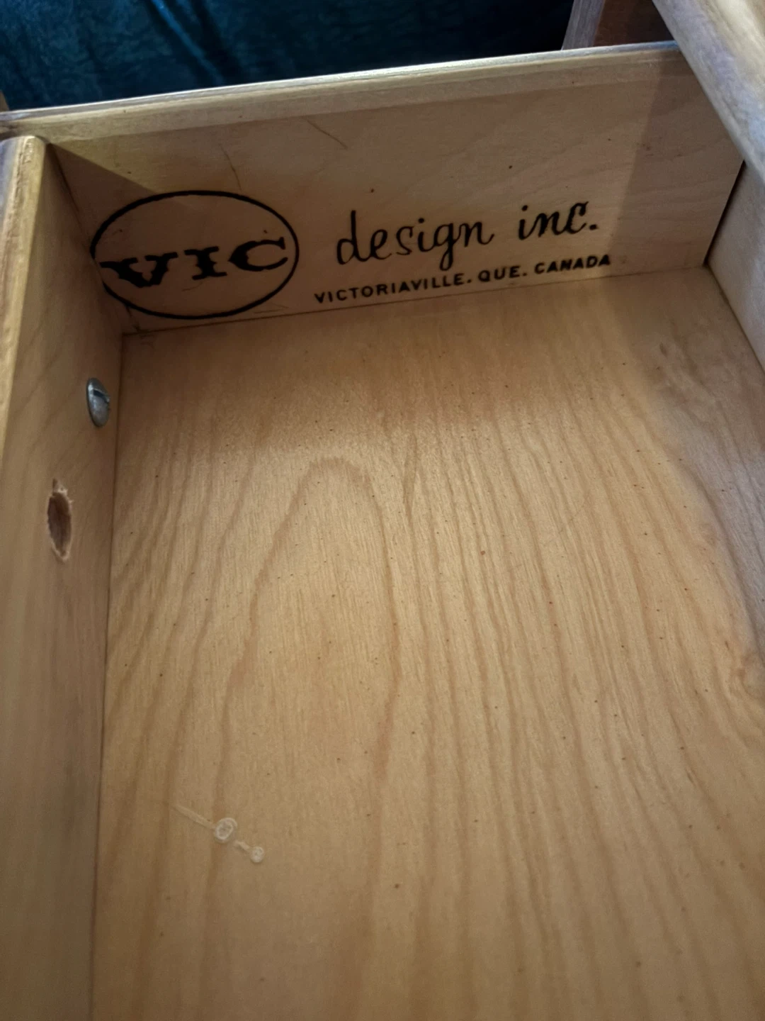 Selling a lovely side table from VIC Design Inc. It's a charming piece with a warm, wooden finish. It features a small shelf and three drawers up top, perfect for storing small items or displaying decor. A great addition to any room!