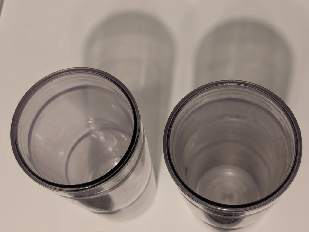 The only reason I'm selling is because I no longer drink the large canned BEvERageS that I used to drink, so they're too large for my needs. They definitely look well-used: can't quite wash away the look of water spots on them, and one is oddly kinda foggy, but they both still seemed perfectly functional temperature-wise when I used them last.