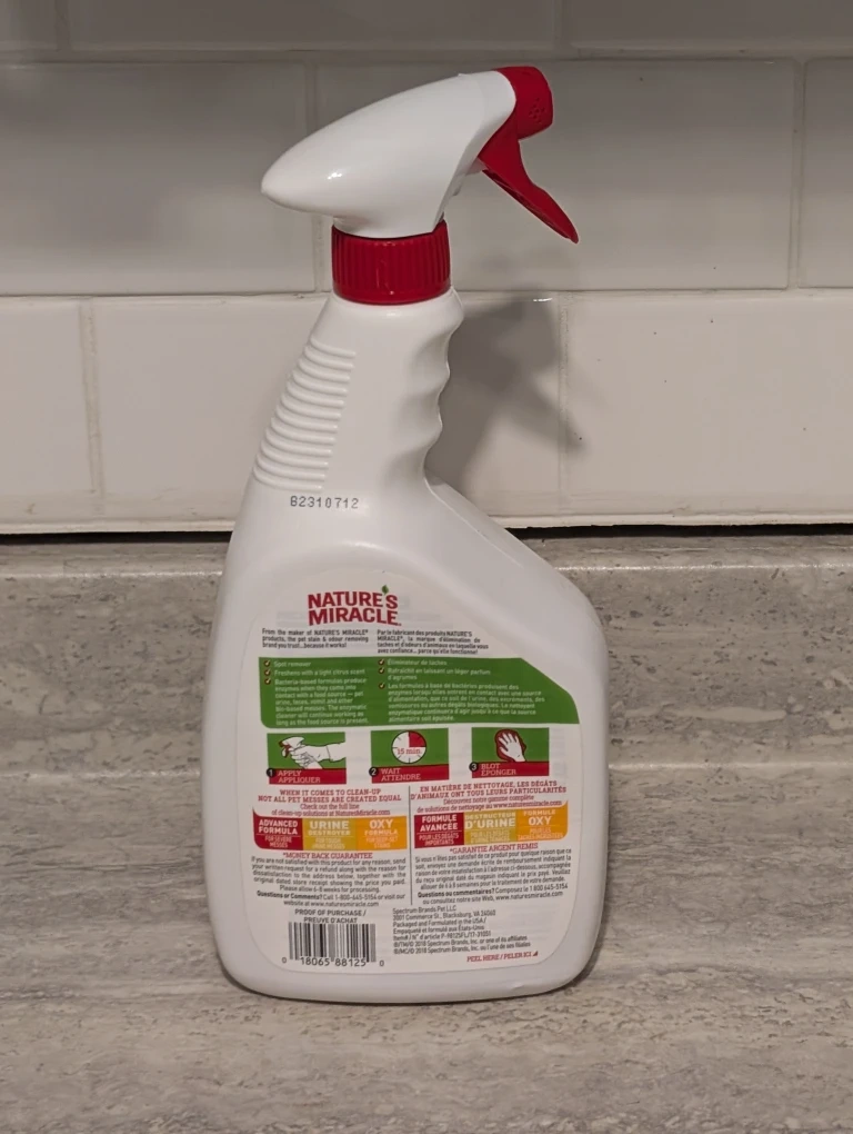 Selling a bottle of the Dog-specific Nature's Miracle Stain & Odour Remover. Its enzymatic formula is designed to eliminate stains and odours caused by dogs.