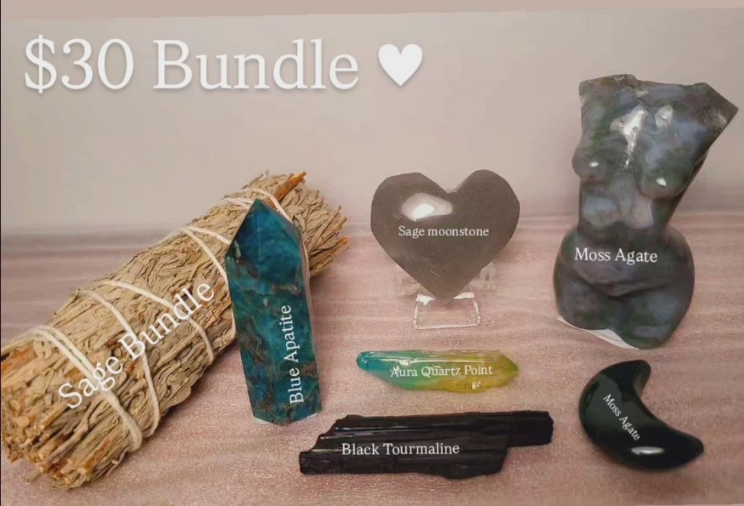 Selling a beautiful crystal bundle for $30! Includes a sage bundle, blue apatite, sage moonstone, moss agate, aura quartz point, and black tourmaline