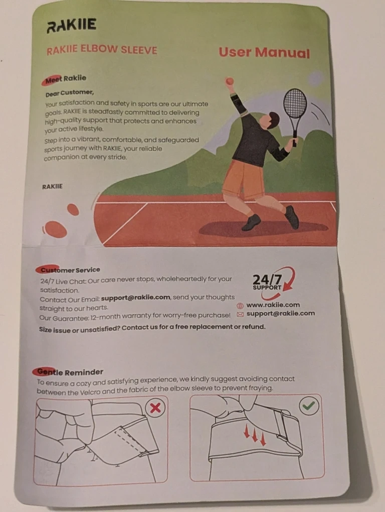 Selling a pair of RAKIIE elbow sleeves, new, in box, with instruction page included.