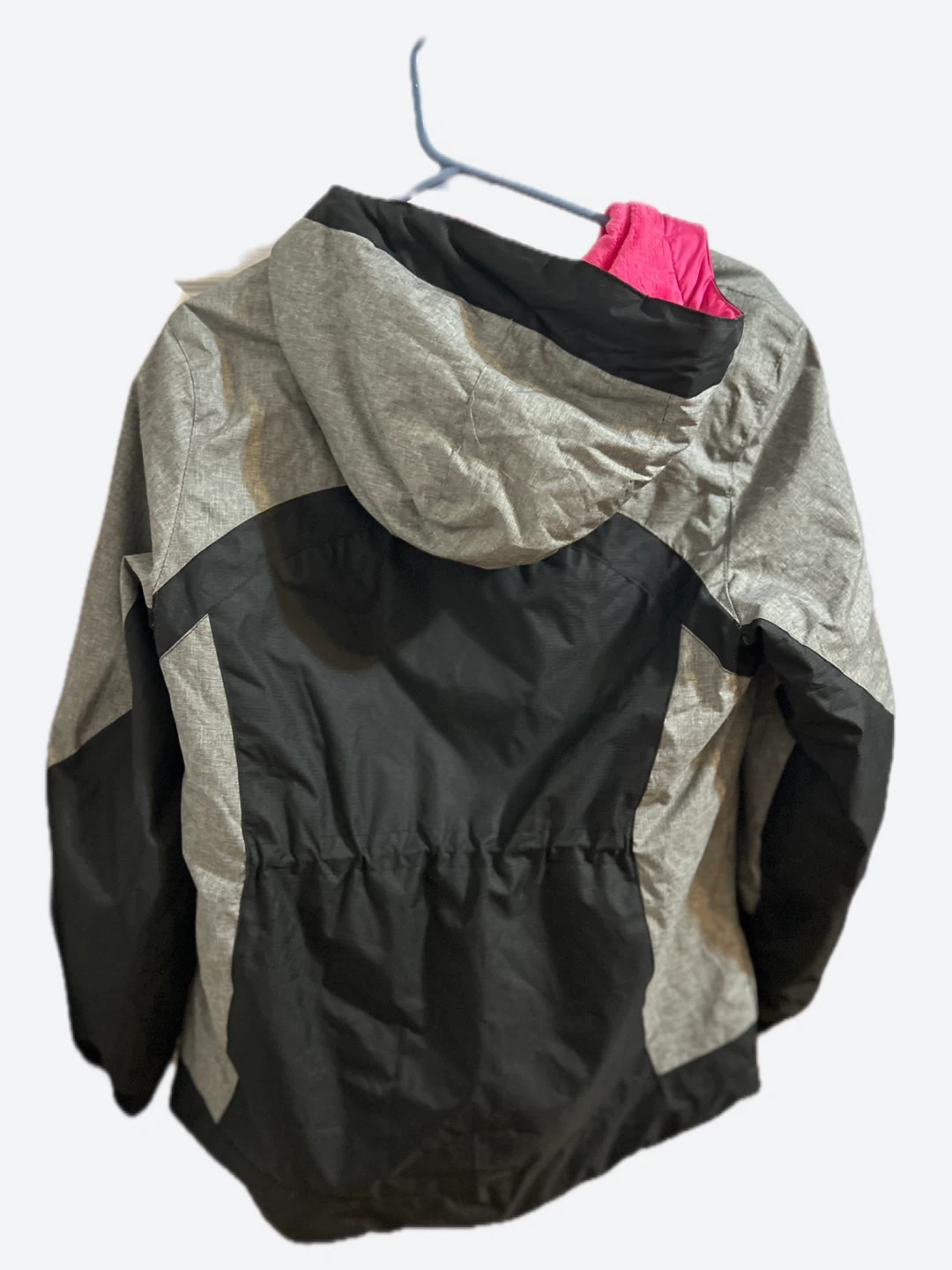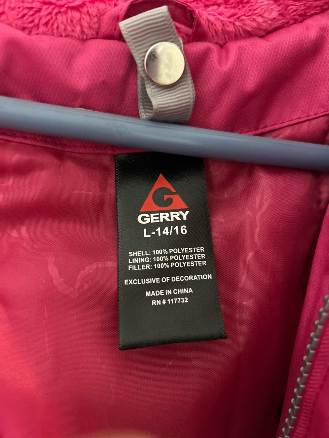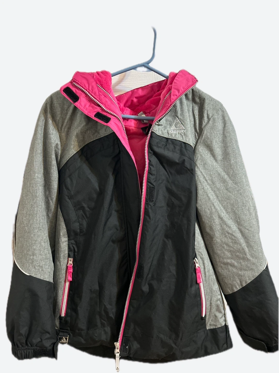 Selling a Gerry girls' winter jacket in size L (14/16). It's a stylish gray and black jacket with a bright pink lining.