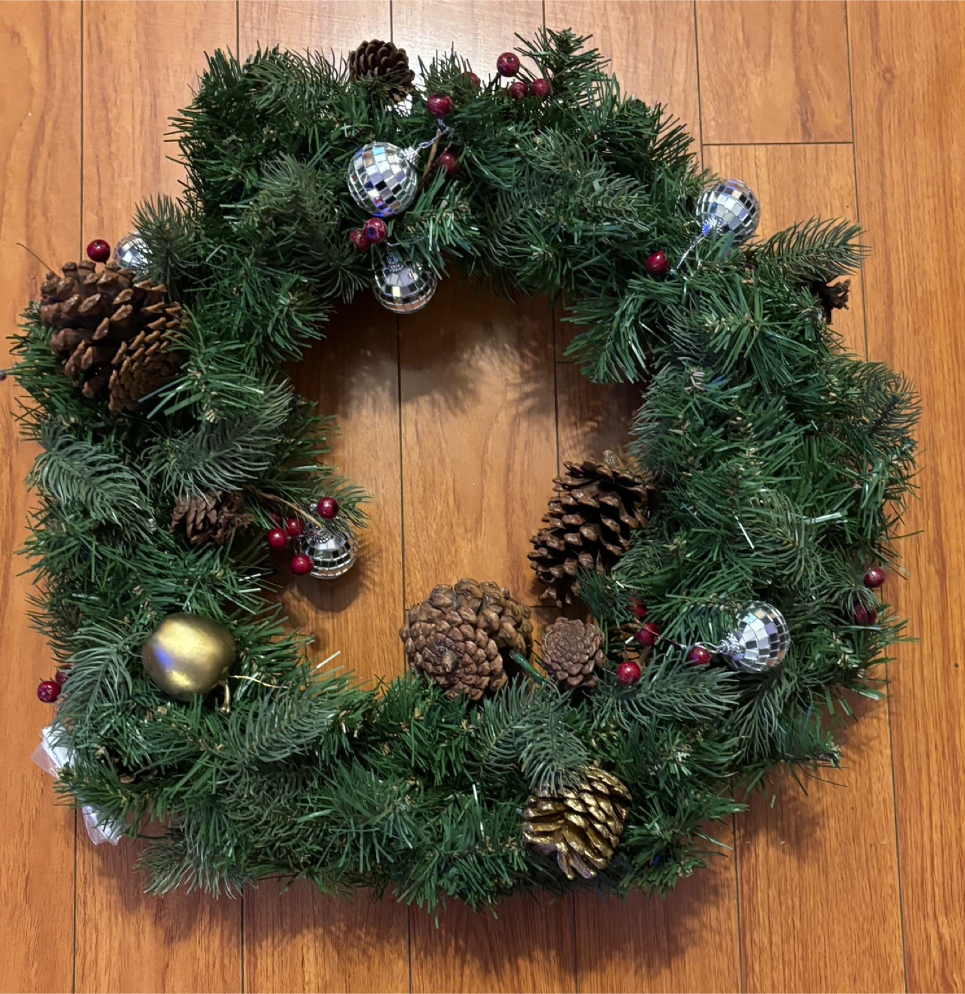 Selling a festive Christmas wreath. It has pinecones and ornaments attached. Perfect for adding some holiday cheer to your home!
