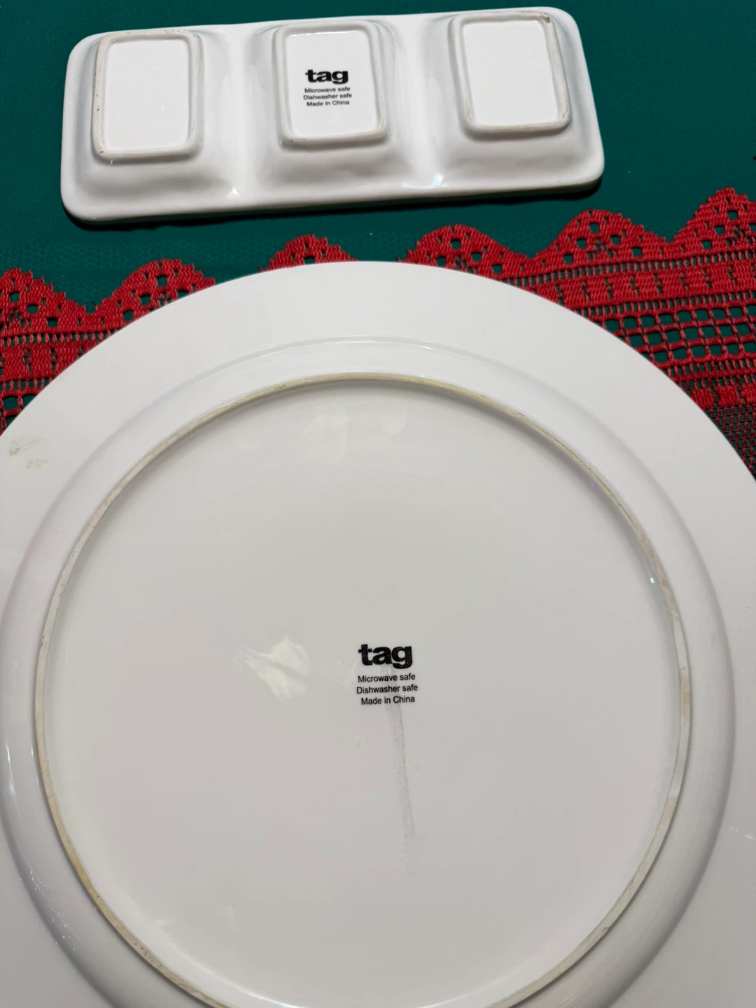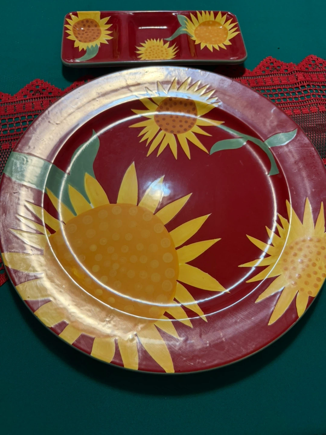 Selling a tag brand plate and dip server set featuring a sunflower design. The plate is a vibrant red with a large sunflower in the center, and the dip server has three sections, each with a sunflower. Microwave and dishwasher safe. Can deliver if within 50km distance.