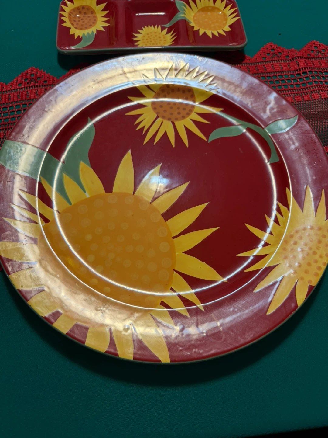 Selling a tag brand plate and dip server set featuring a sunflower design. The plate is a vibrant red with a large sunflower in the center, and the dip server has three sections, each with a sunflower. Microwave and dishwasher safe. Can deliver if within 50km distance.