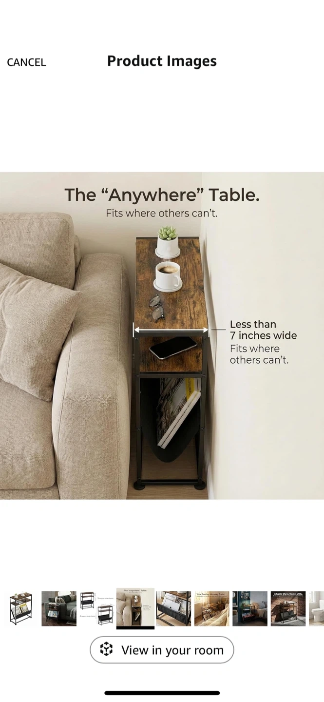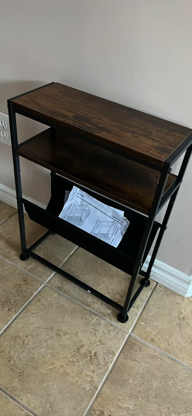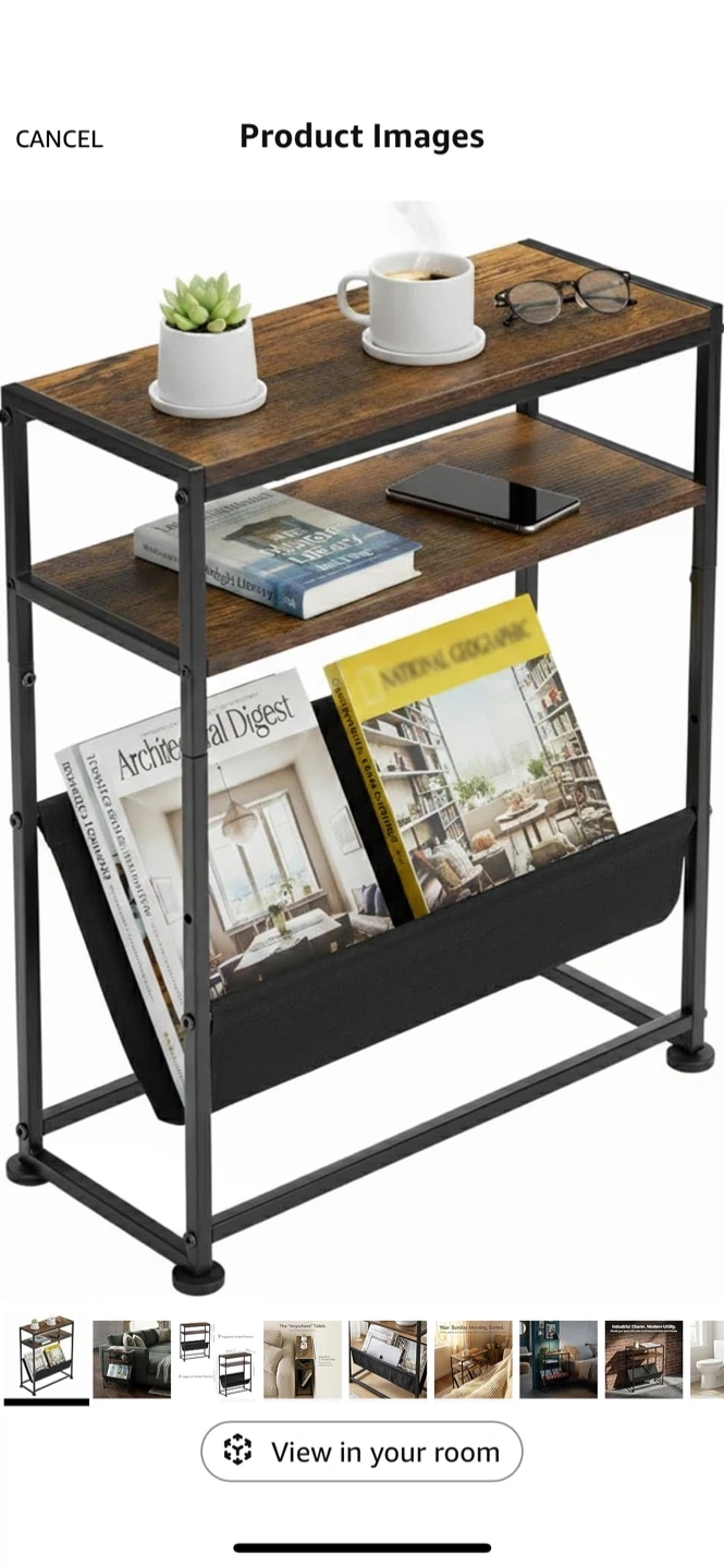 Selling a slim end table, perfect for tight spaces! It's less than 7 inches wide, so it fits where other tables can't. It's great for holding magazines and other items.