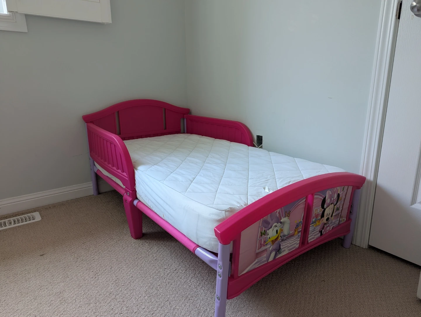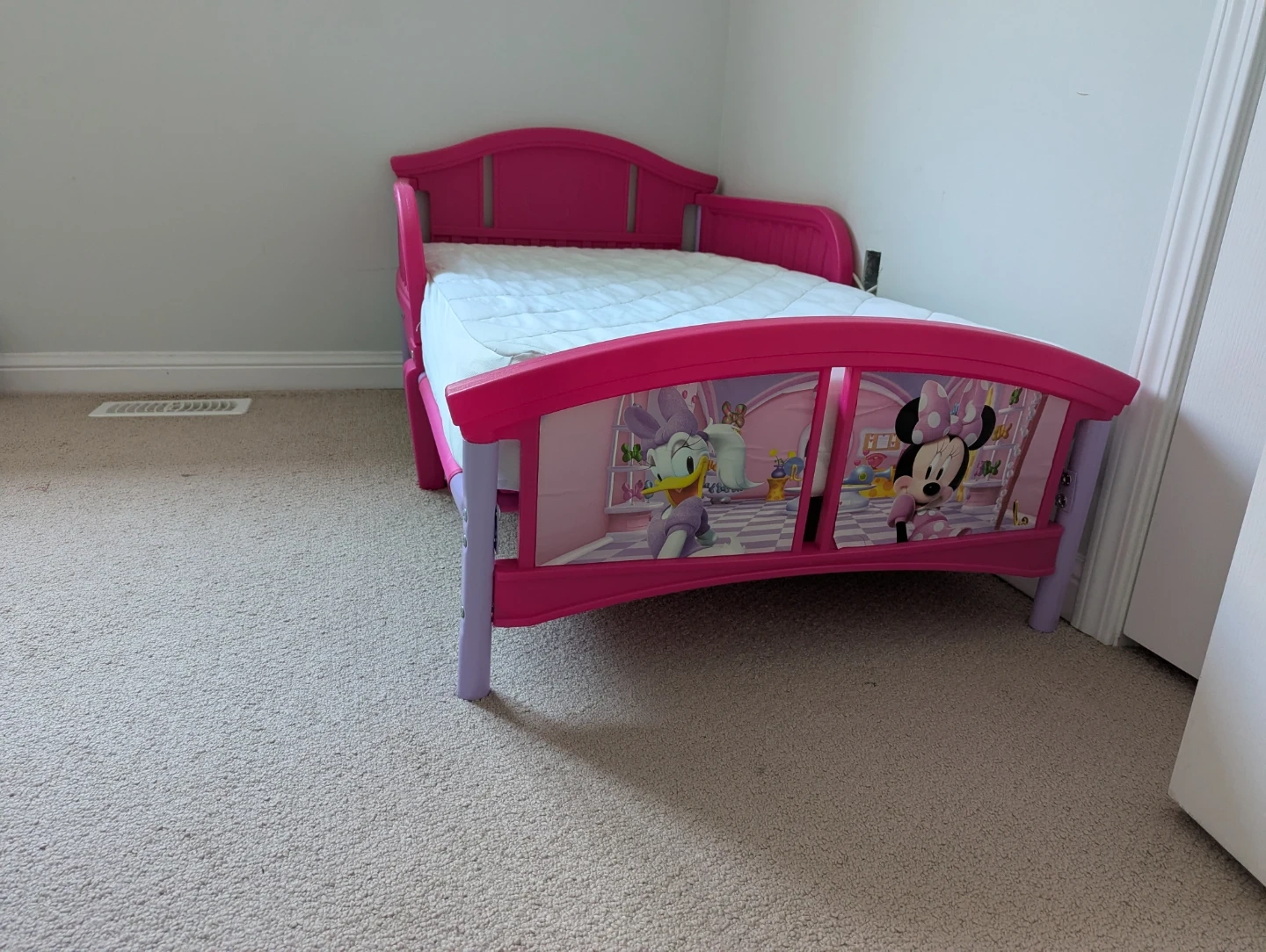 Selling a cute Minnie Mouse toddler bed! It's in great shape and ready for a new little one. The bed frame is pink with purple accents and features Minnie Mouse and Daisy Duck graphics on the headboard and footboard. Perfect for transitioning your little one from a crib to a bed