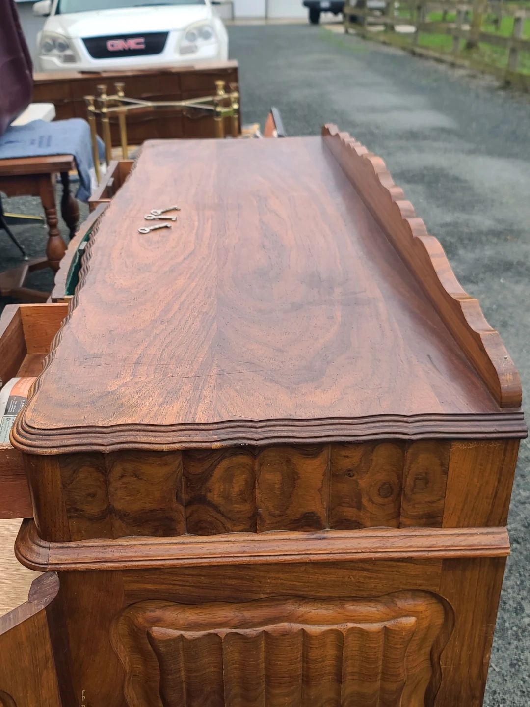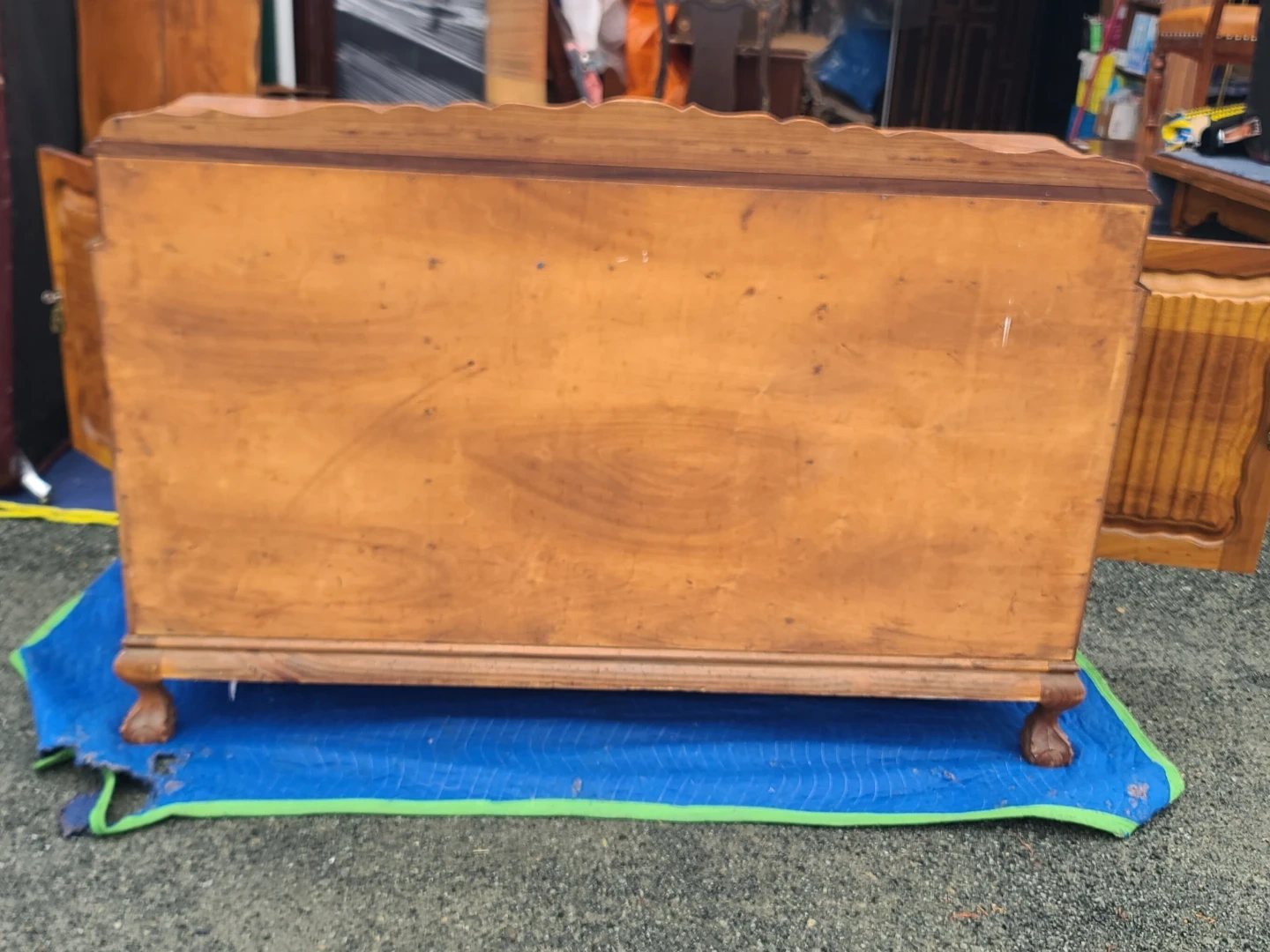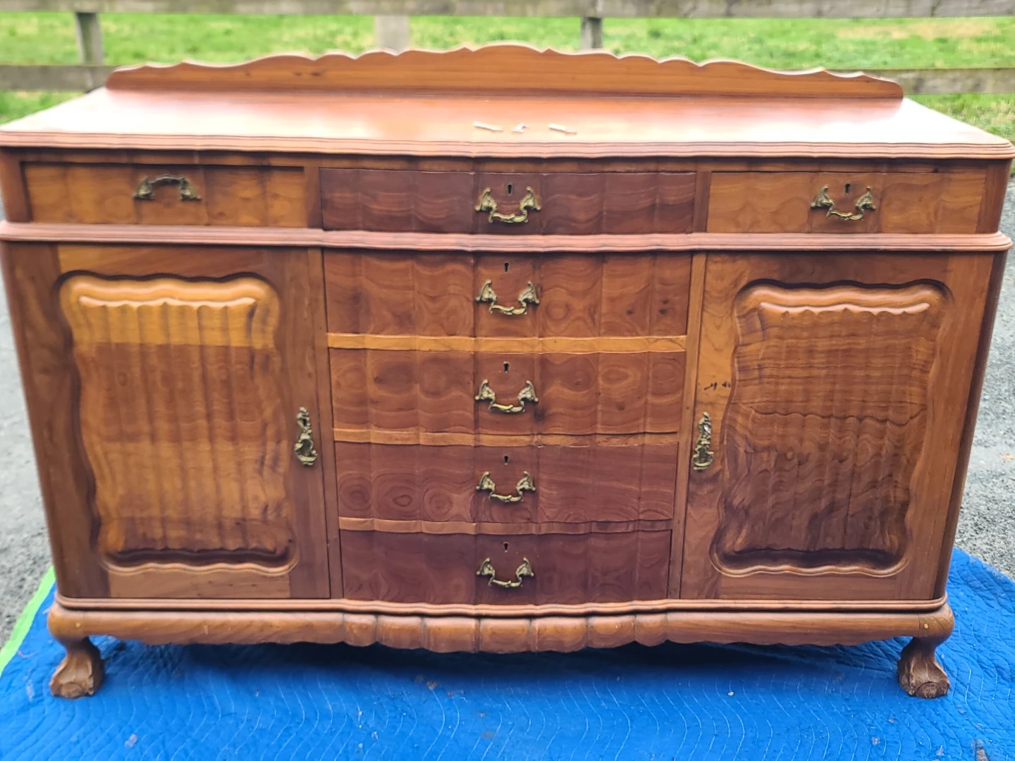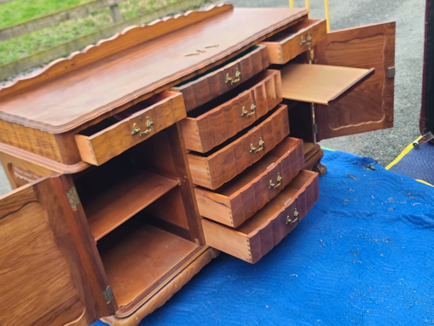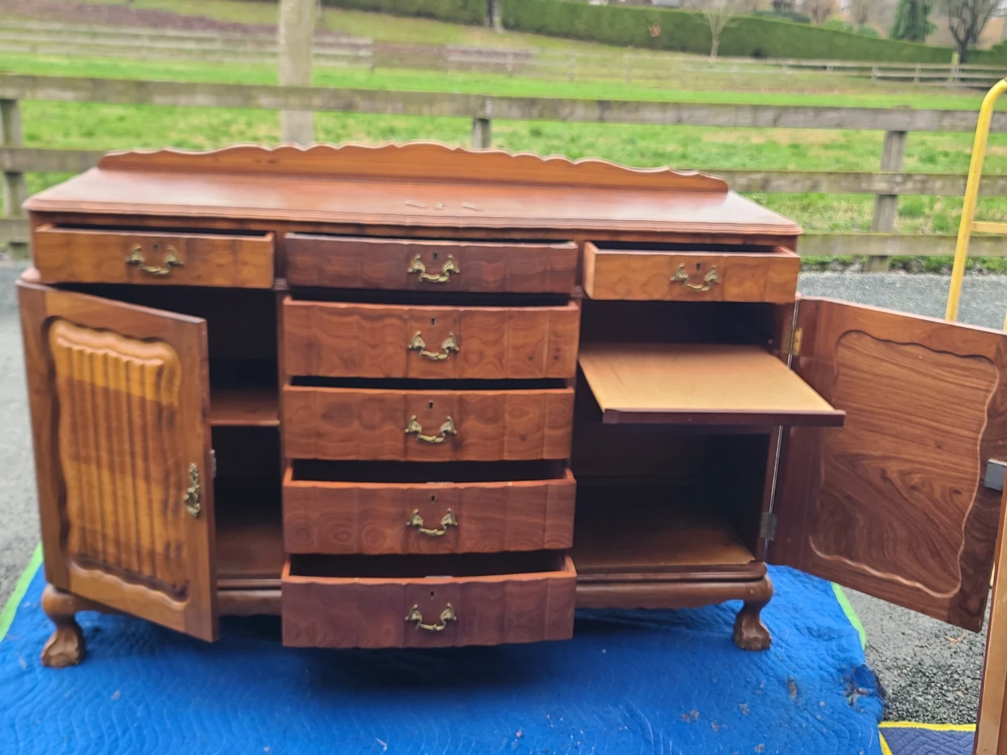 This is a high-quality, well-built piece featuring stunning natural wood grain, classic detailing, and original brass hardware. Includes multiple smooth-sliding dovetail drawers and two side cabinets with interior shelving—perfect for dining room storage, a buffet, or even a statement entryway piece. Sturdy construction with timeless design that works well in both traditional and mid-century styled homes. Measurements to follow. Viewing and pickup by appointment.