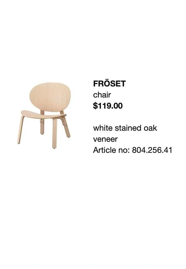 Buy & SellIKEA FRÖSET Lounge Chair – White Stained Oak VeneerIKEA FRÖSET Lounge Chair – White Stained Oak Veneer$69Declutter sale. IKEA FRÖSET chair in great condition. Pickup in Burnaby.ConditionNewWHERE TO MEETCheck LocationView MapSELLERverifiedAlpha DarlingMetrotown1226 reviews1 chats·2 favorites·49 viewsSEND CHAT TO SELLERHi Alpha Darling! I’m interested in your listing.Hi Alpha Darling! I’m interested in your listing.Get the Karrot app to chatSign In to chat