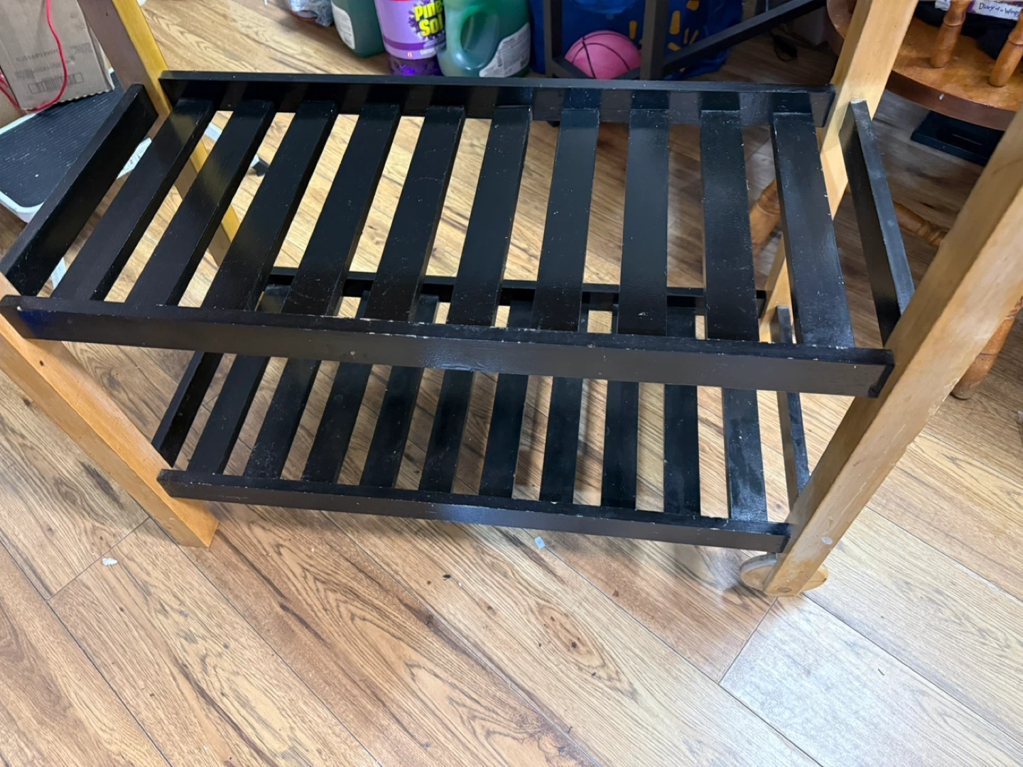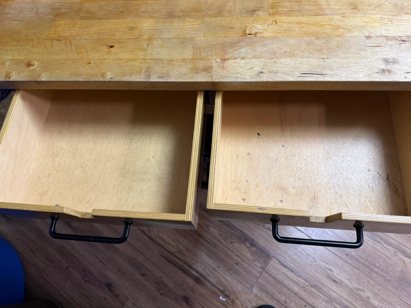 Selling a kitchen island with a wooden top and black storage shelves. It also has two drawers for extra storage! It's in good condition and ready for a new kitchen.