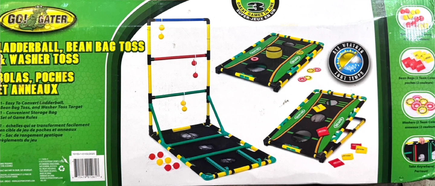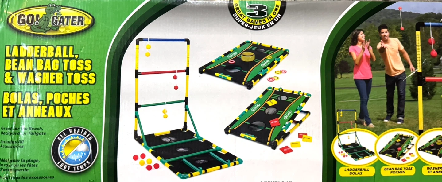 Get ready for some fun with this Go! Gater 3-in-1 game set! It includes ladderball, bean bag toss, and washer toss. Perfect for the beach, backyard, or tailgate. All weather and includes accessories