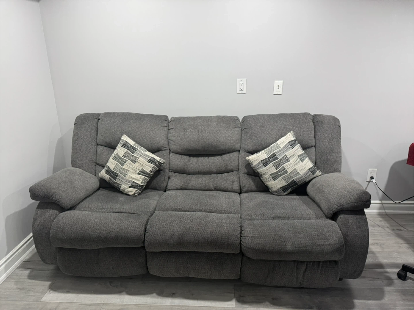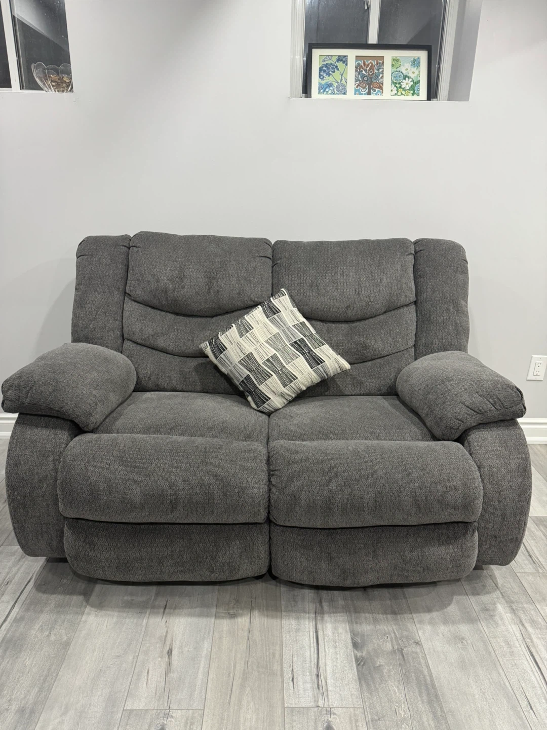 Selling Ashley comfy grey reclining sofa set! It includes a three-seater sofa and a two-seater sofa. Well maintained and clean from a smoke free home. Wide and comfortable seating with smooth reclining mechanism. Perfect for a living room or entertainment area. Loveseat hardly used and 3 seater in very good condition.