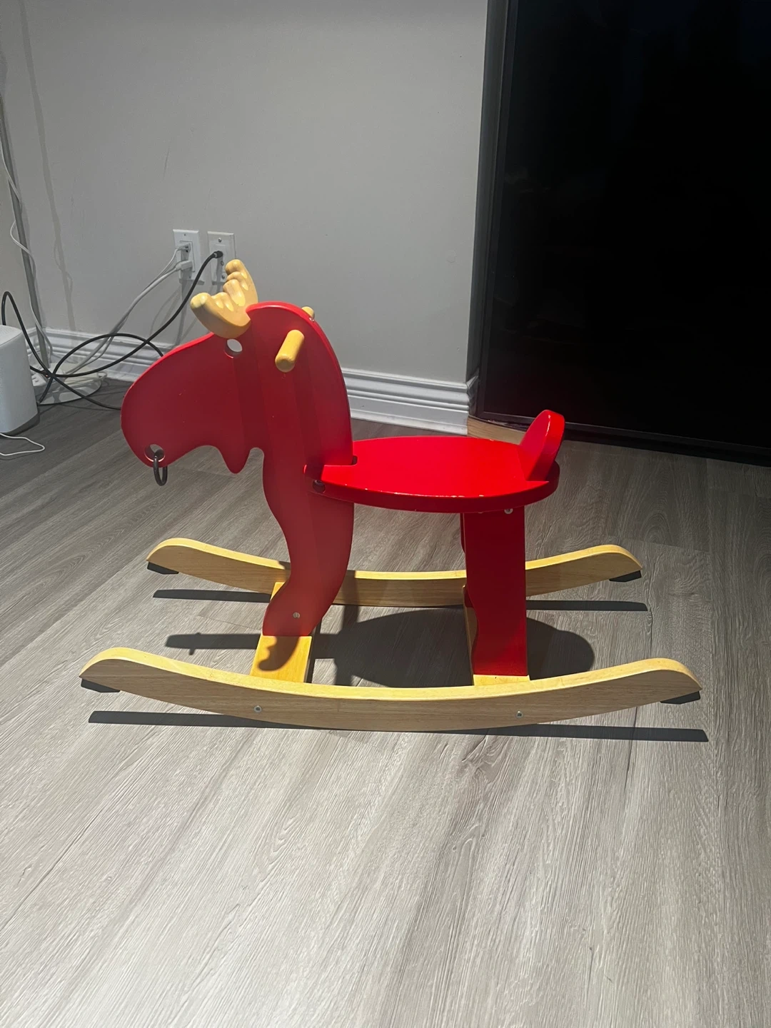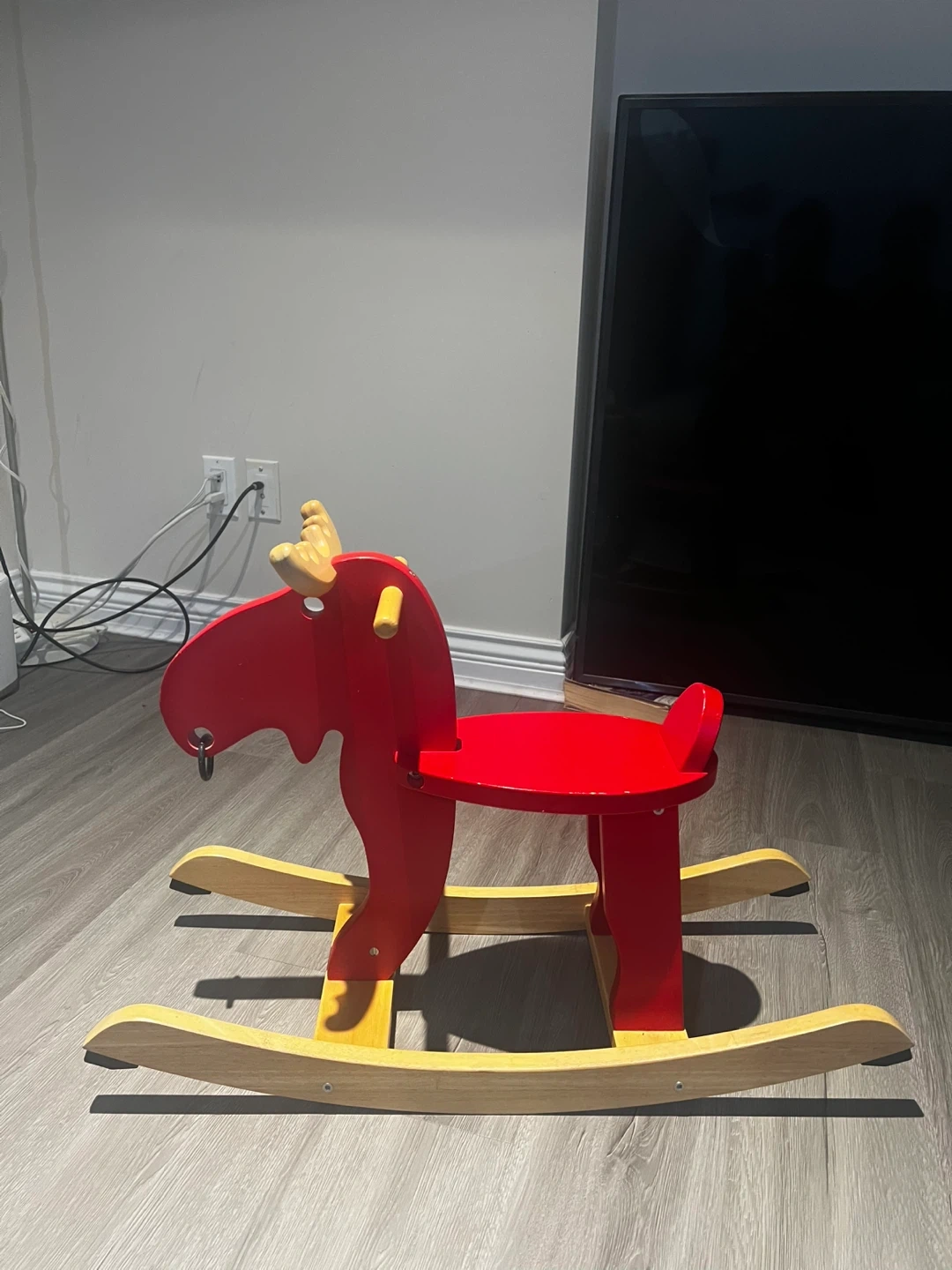 Here's a cute red wooden rocking moose for your little one! It's in great condition and ready for a new home. The moose is red with yellow accents and a natural wood base. Perfect for hours of fun and imaginative play!