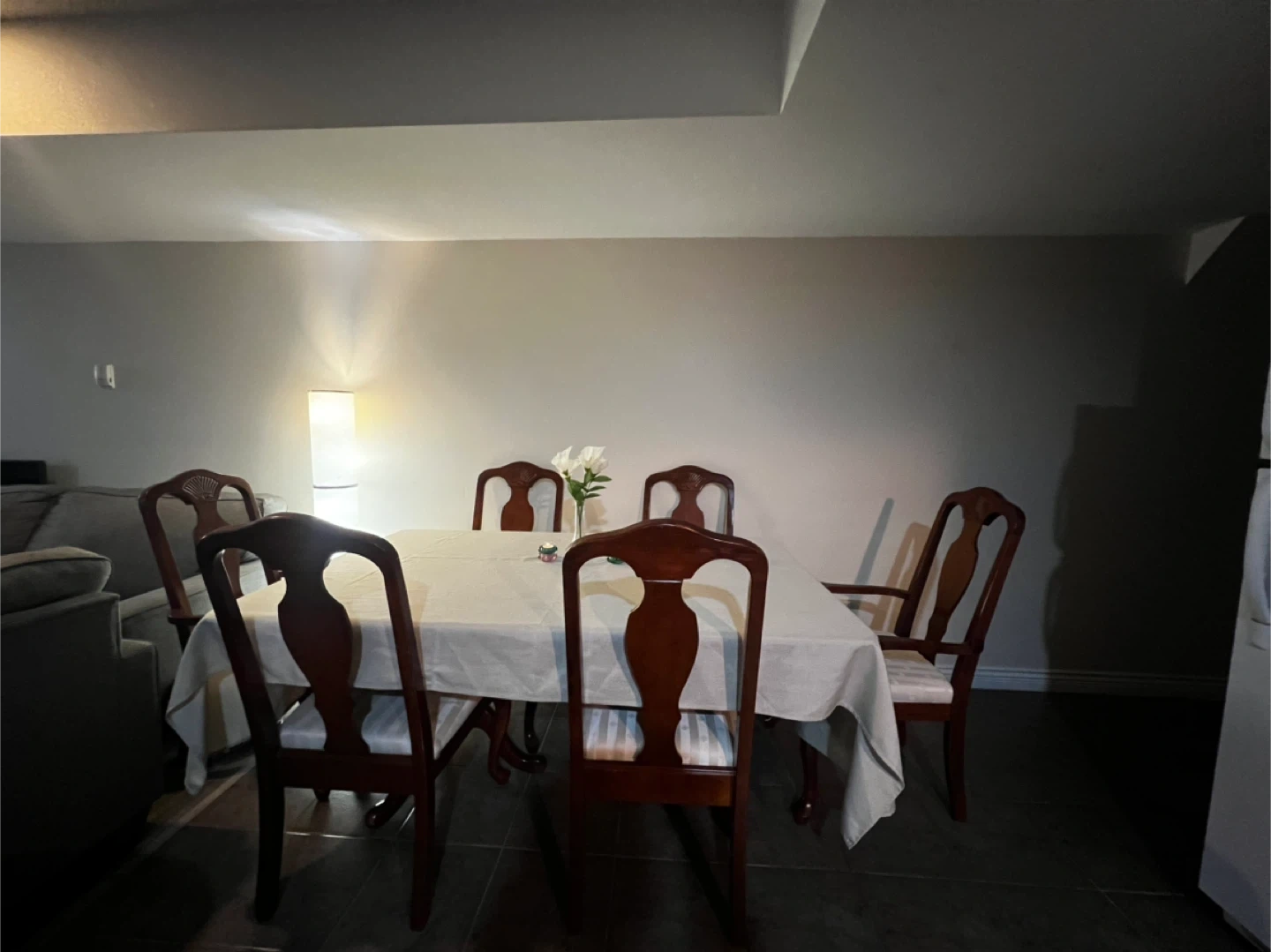 Selling a extendable dining table with six chairs. The table is covered with a white tablecloth, and the chairs have a wooden frame with striped cushions. Great for family dinners or gatherings!