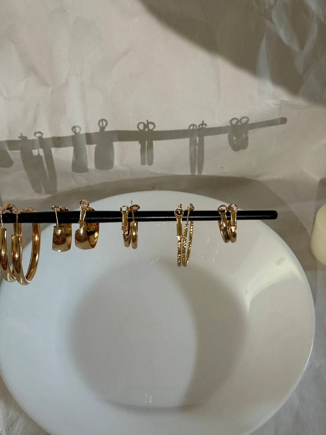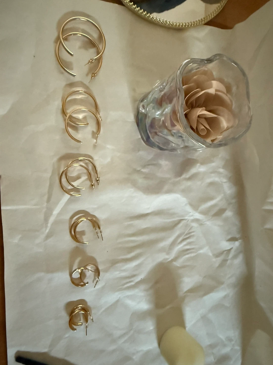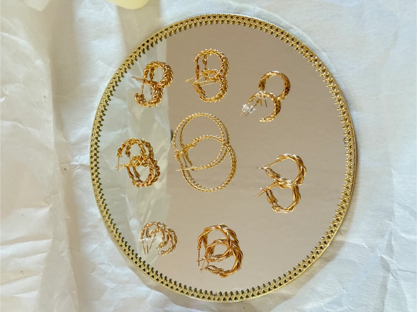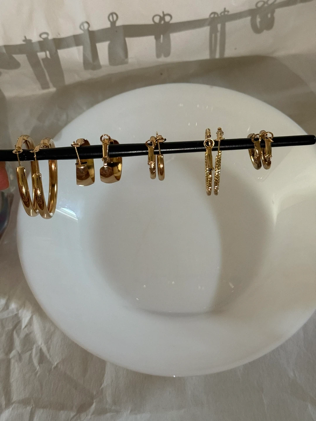 Selling a collection of gold hoop earrings. There's a variety of styles and sizes, perfect for adding a touch of sparkle to any outfit!Any 5 mix and match with any sizes.