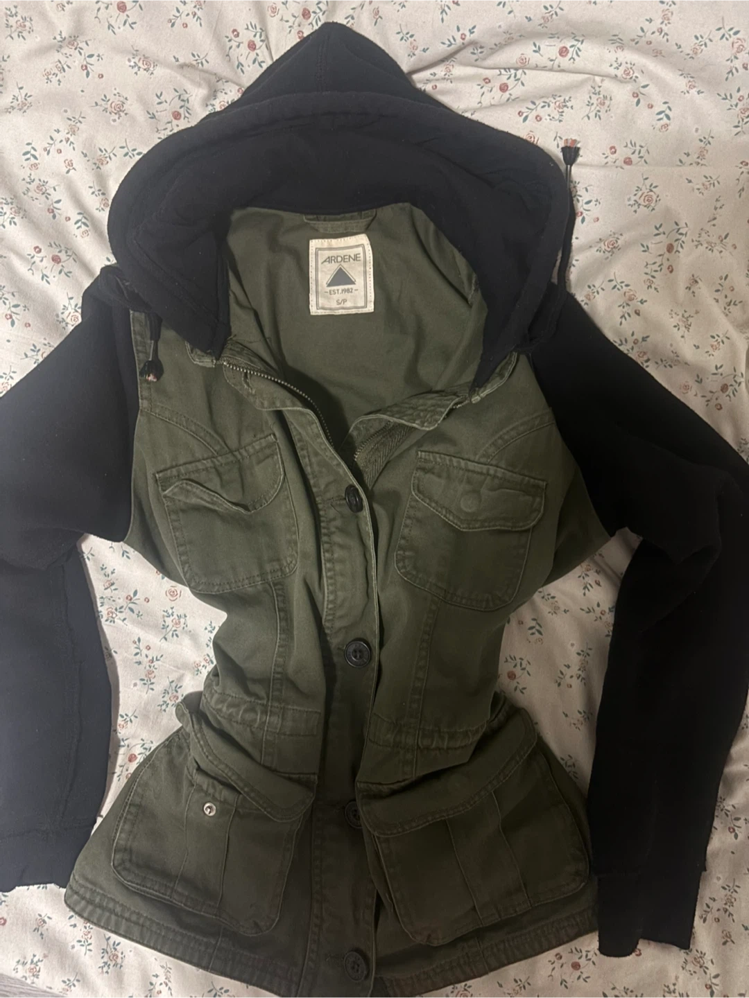 Selling an fitted jacket in olive green with a black hoodie. It's a size S/P. It has a button-up front and lots of pockets!
