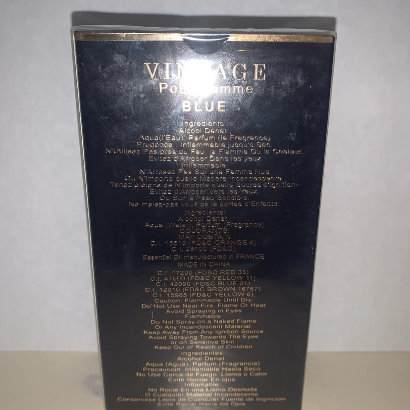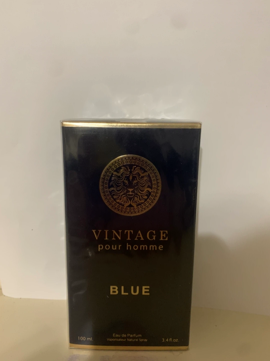 Vintage Pour Homme Blue, 3.4 fl.oz. The box includes ingredient information and caution details. Essential oil manufactured in France. Made in China.