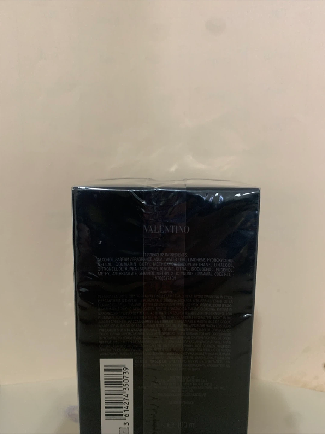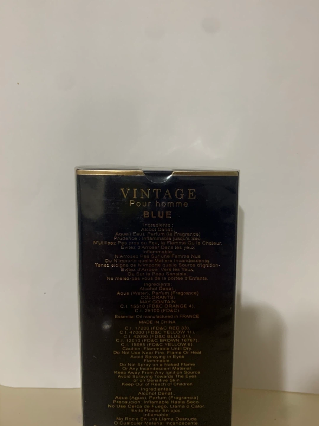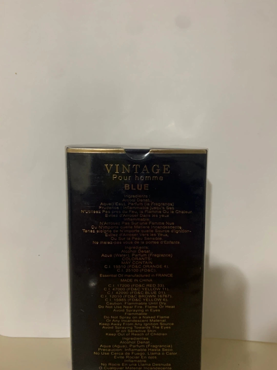 Vintage Pour Homme Blue, 3.4 fl.oz. The box includes ingredient information and caution details. Essential oil manufactured in France. Made in China.