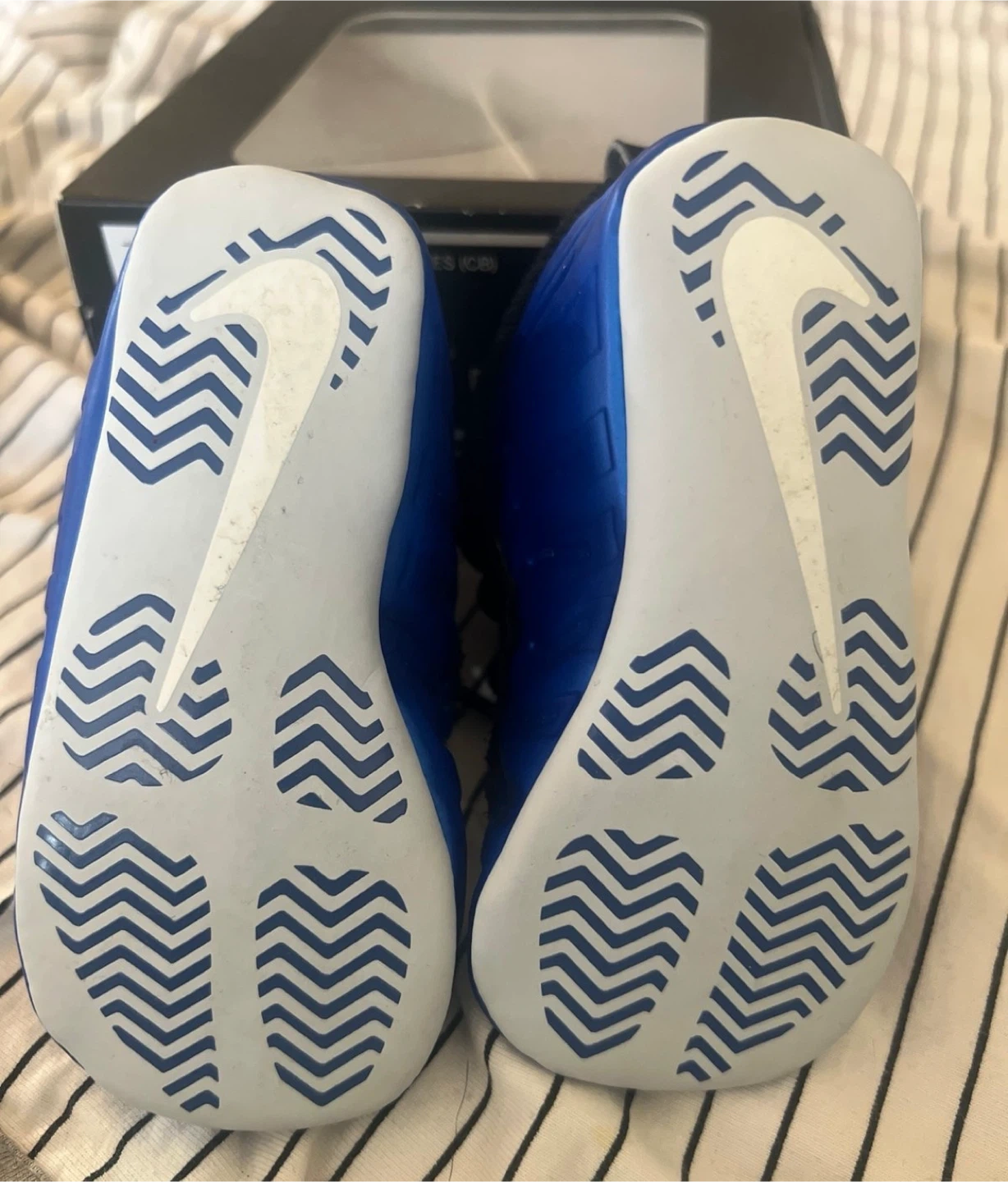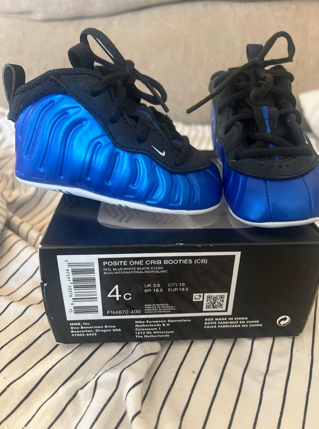Selling a pair of Nike Posite One Crib Booties in size 4C! They're in great condition and come with the original box. The colors are a cool mix of blue, white, black, and grey. Perfect for your little one!