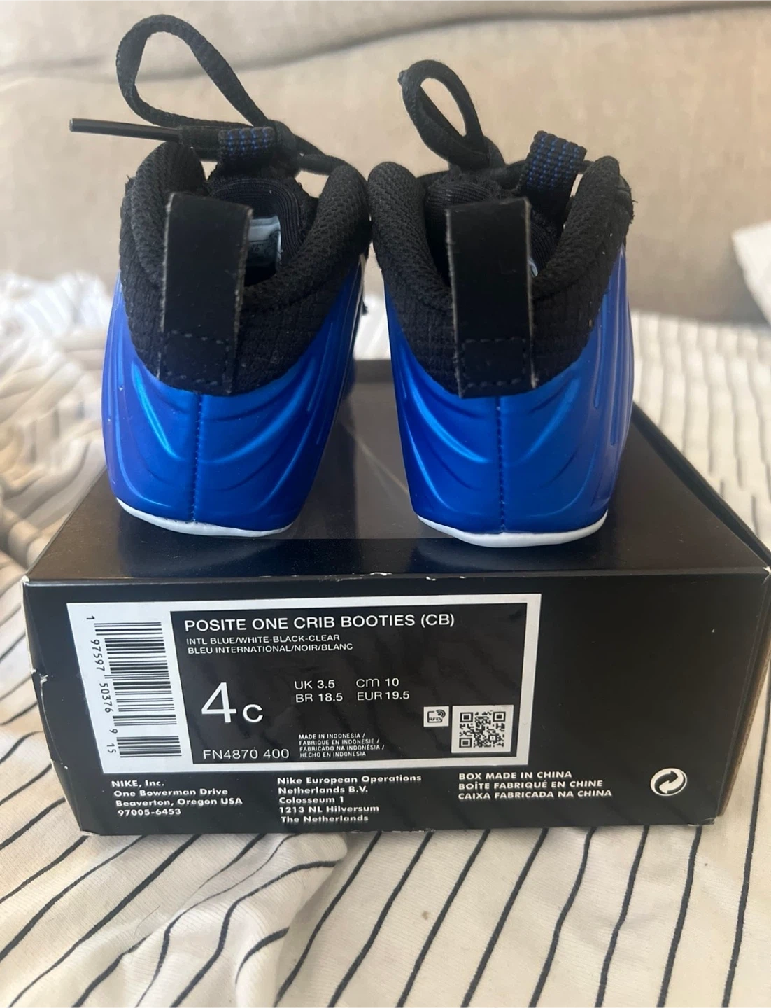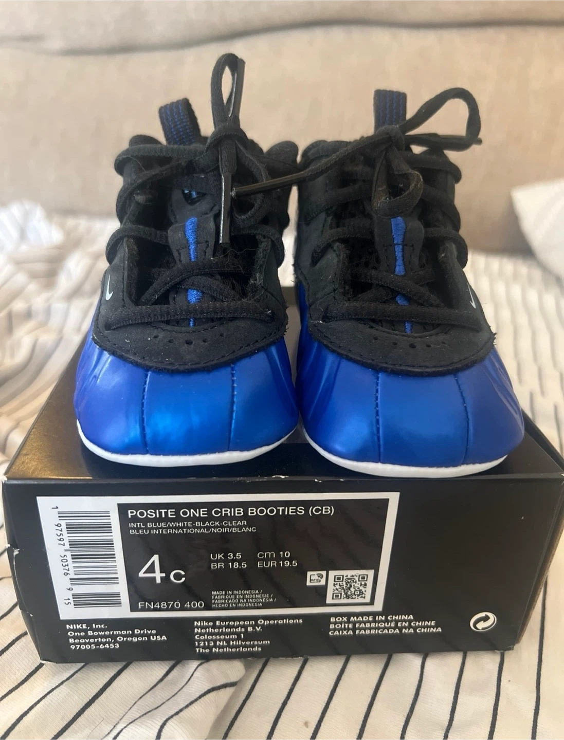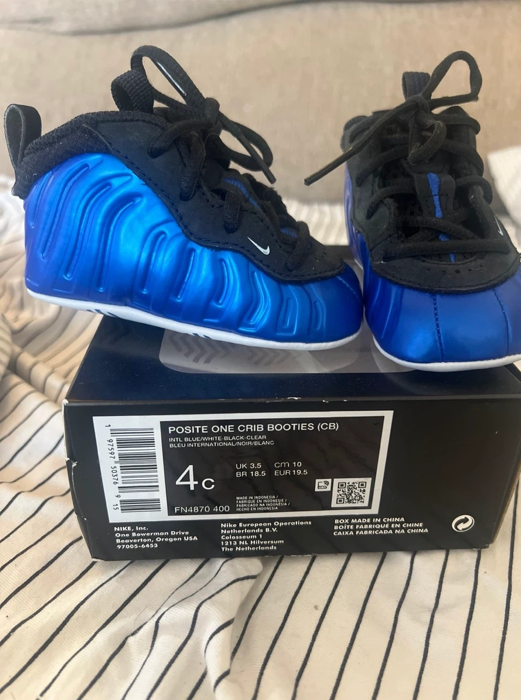 Selling a pair of Nike Posite One Crib Booties in size 4C! They're in great condition and come with the original box. The colors are a cool mix of blue, white, black, and grey. Perfect for your little one!