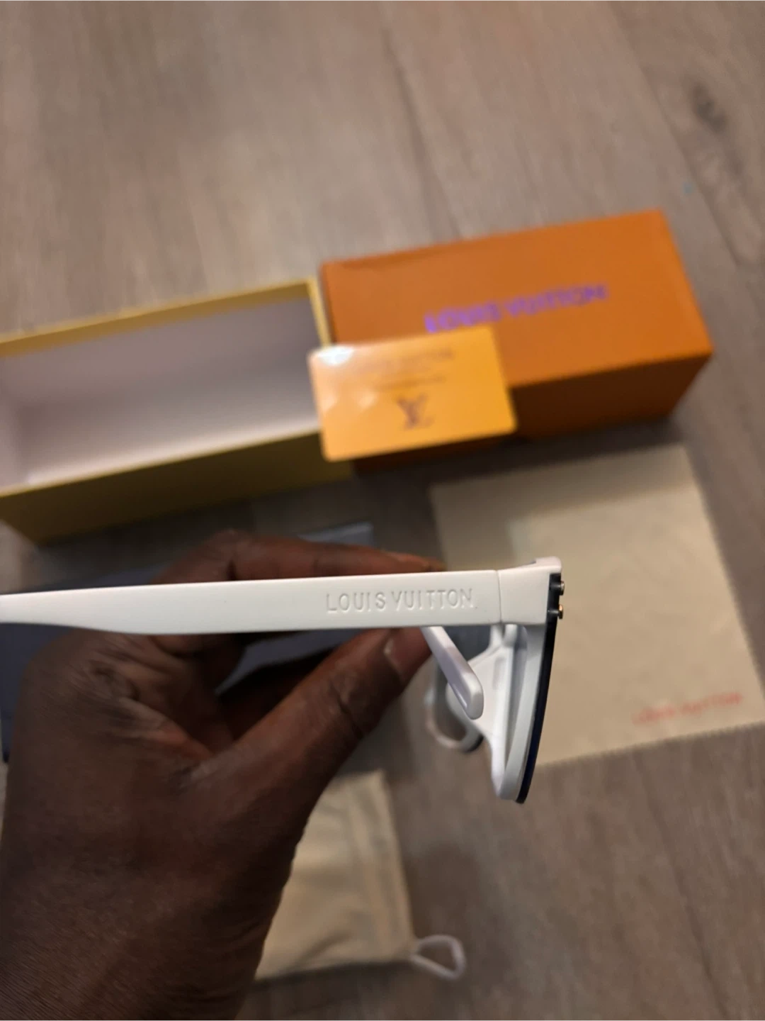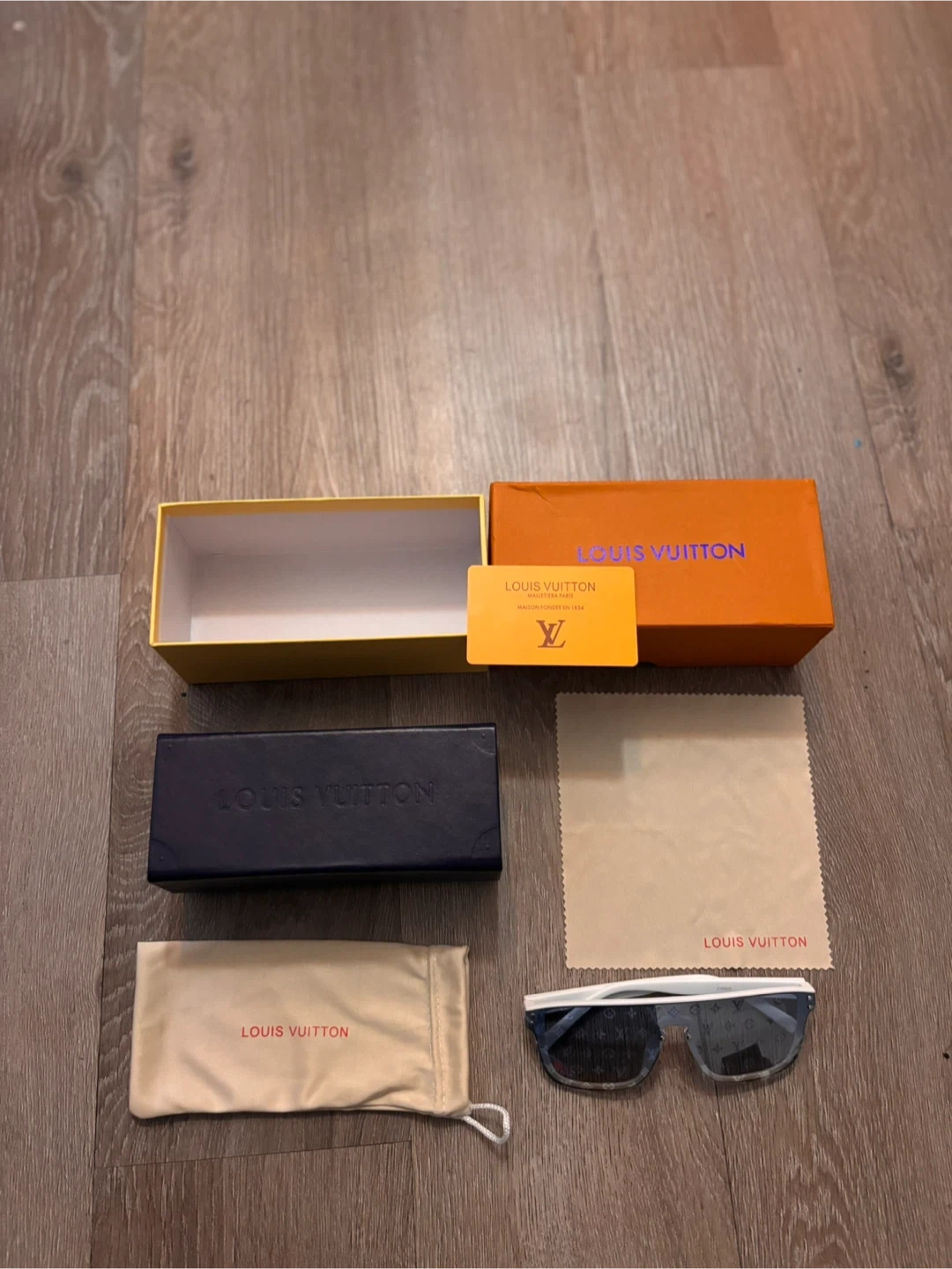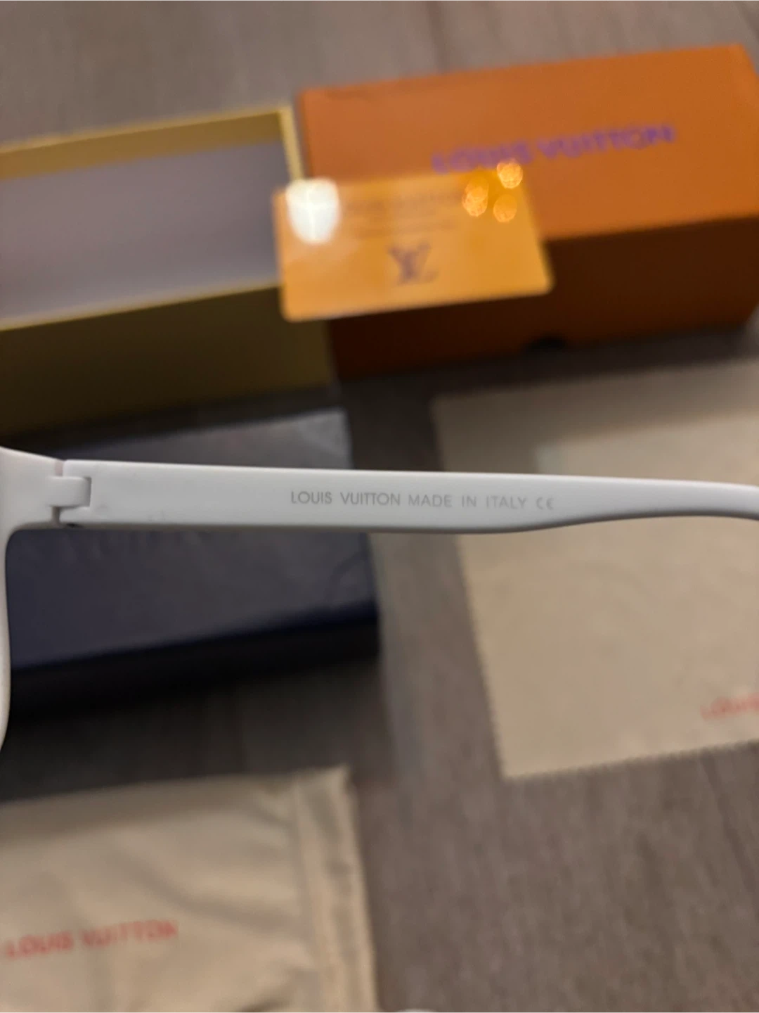 Selling a pair of Louis Vuitton sunglasses with a stylish white frame. They come with the original box and accessories, including a dust bag and cleaning cloth. Perfect for adding a touch of luxury to your look!
