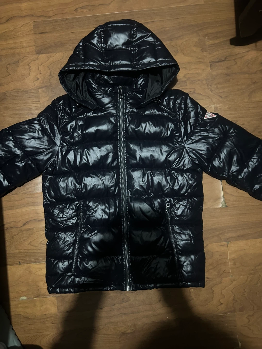 Selling a Guess black puffer jacket. It's in great condition and ready to keep you warm! The jacket features a glossy finish and a quilted design.