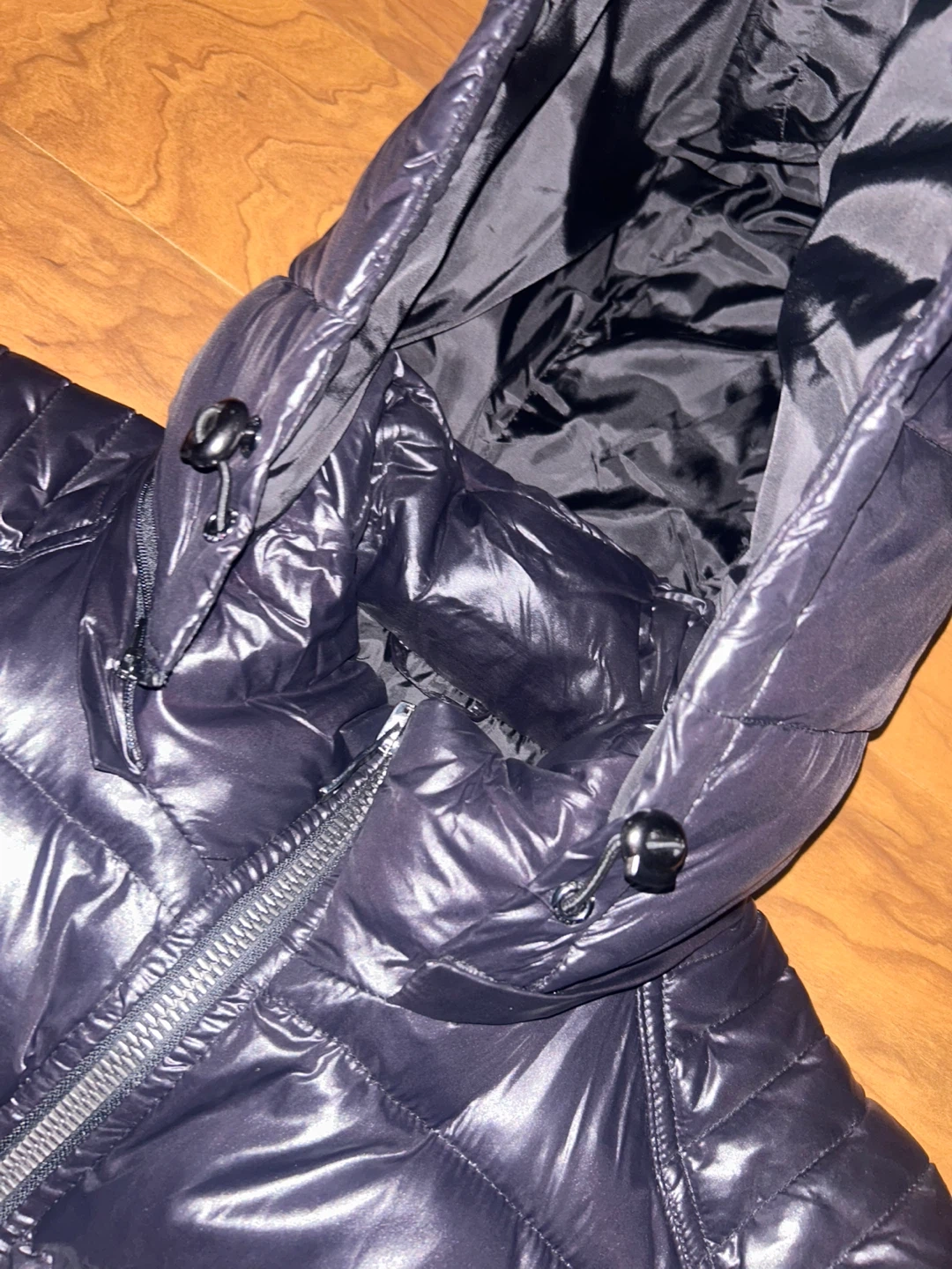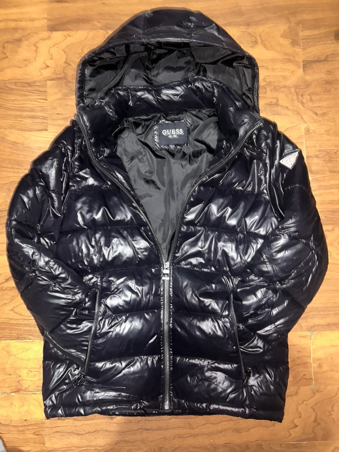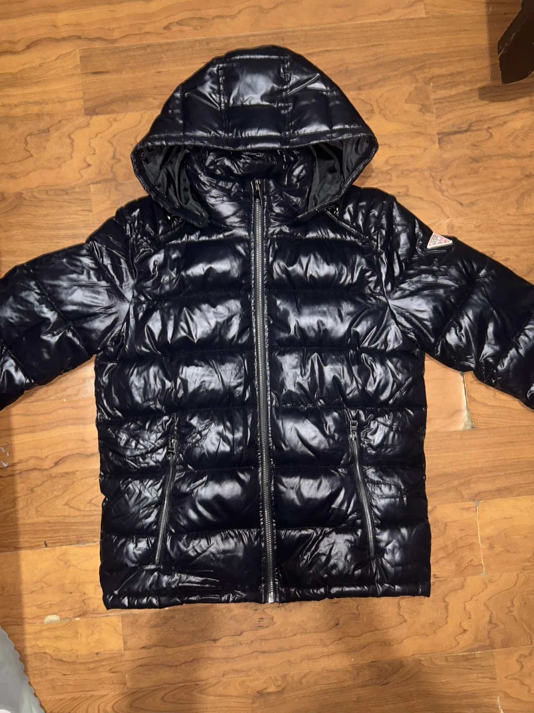 Selling a Guess black puffer jacket. It's in great condition and ready to keep you warm! The jacket features a glossy finish and a quilted design.
