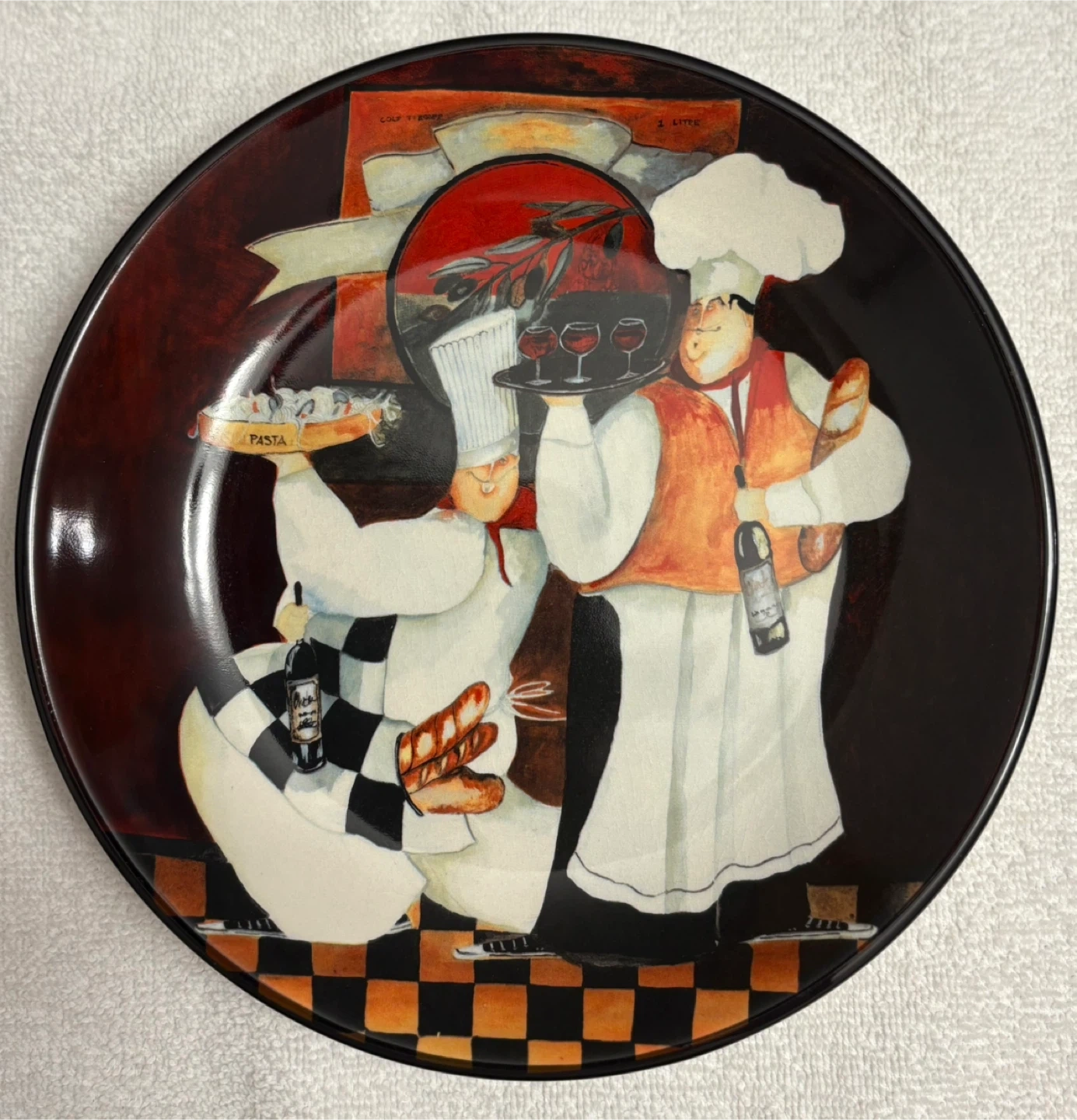 It's dishwasher and microwave safe, for reheating only. This plate features a chef design with a red and black border. No chips or cracks on the plate.