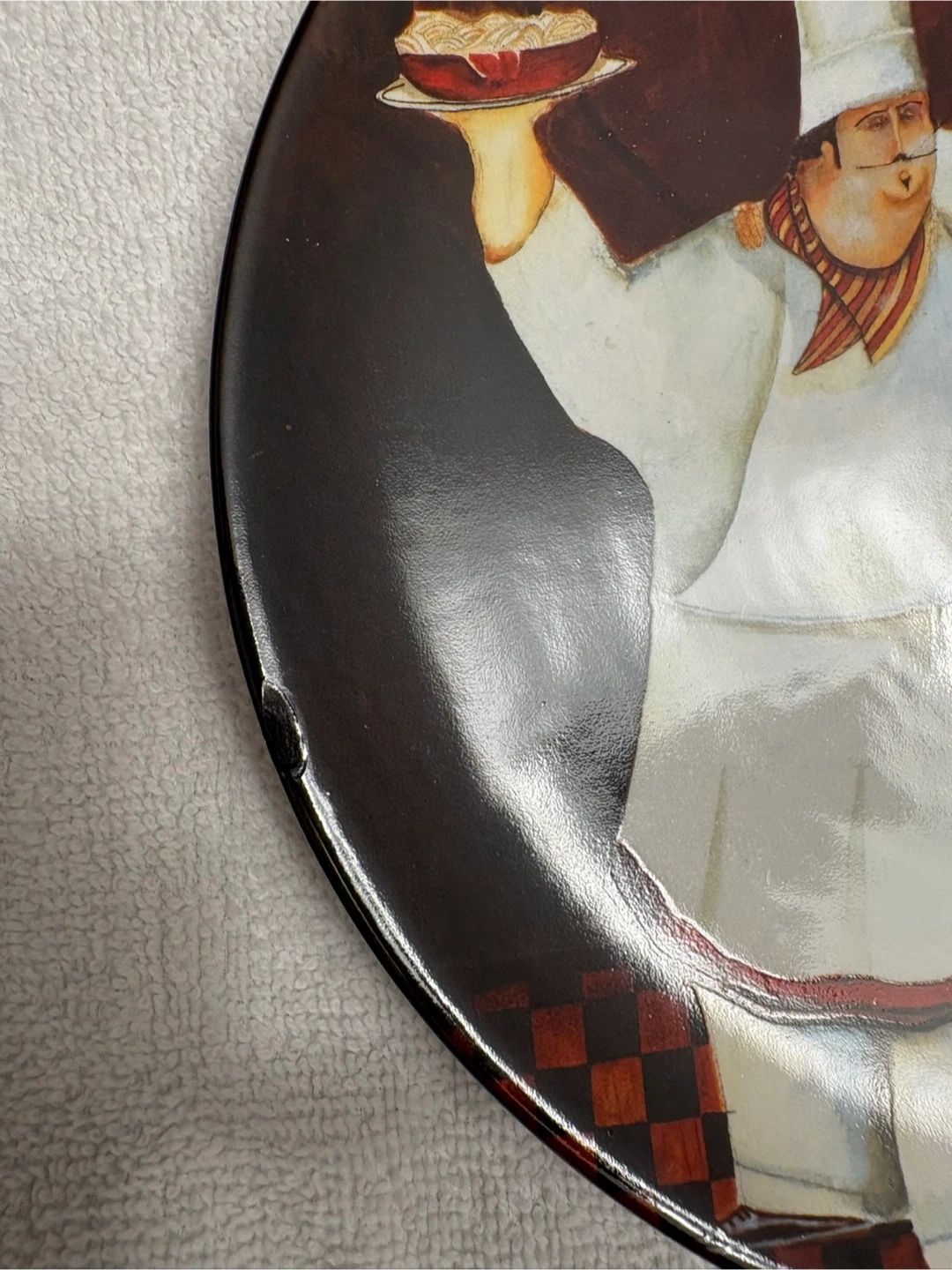 It's dishwasher and microwave safe, for reheating only. This plate features a chef design with the title Mia Cucina at the top. There is a small chip on the left-hand side, which is not noticeable from a distance.